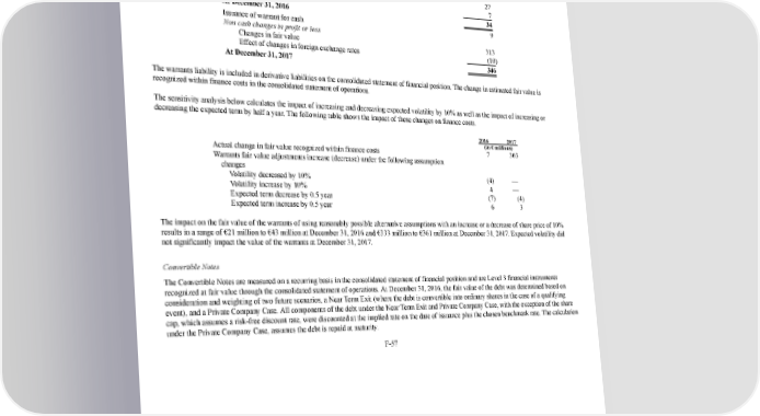 250/264 Notes to the 2017 consolidated financial statements The table below presents the changes in the warrants liability as at December 31: (in € millions) At January 1, 2016 — Issuance of warrants for cash 27 Loss recognized in profit or loss 7 At December 31, 2016 34 Issuance of warrant for cash 9 Non cash changes in profit or loss Changes in fair value 313 Effect of changes in foreign exchange rates (10 ) At December 31, 2017 346 The warrants liability is included in derivative liabilities on the consolidated statement of financial position. The change in estimated fair value is recognized within finance costs in the consolidated statement of operations. The sensitivity analysis below calculates the impact of increasing and decreasing expected volatility by 10% as well as the impact of increasing or decreasing the expected term by half a year. The following table shows the impact of these changes on finance costs. 2016 2017 (in € millions) Actual change in fair value recognized within finance costs 7 303 Warrants fair value adjustments increase (decrease) under the following assumption changes Volatility decreased by 10% (4 ) — Volatility increase by 10% 4 — Expected term decrease by 0.5 year (7 ) (4 ) Expected term increase by 0.5 year 6 3 The impact on the fair value of the warrants of using reasonably possible alternative assumptions with an increase or a decrease of share price of 10% results in a range of €21 million to €43 million at December 31, 2016 and €333 million to €361 million at December 31, 2017. Expected volatility did not significantly impact the value of the warrants at December 31, 2017. Convertible Notes The Convertible Notes are measured on a recurring basis in the consolidated statement of financial position and are Level 3 financial instruments recognized at fair value through the consolidated statement of operations. At December 31, 2016, the fair value of the debt was determined based on consideration and weighting of two future scenarios, a Near Term Exit (where the debt is convertible into ordinary shares in the case of a qualifying event), and a Private Company Case. All components of the debt under the Near Term Exit and Private Company Case, with the exception of the share cap, which assumes a riskfree discount rate, were discounted at the implied rate on the date of issuance plus the chosen benchmark rate. The calculation under the Private Company Case, assumes the debt is repaid at maturity. F57