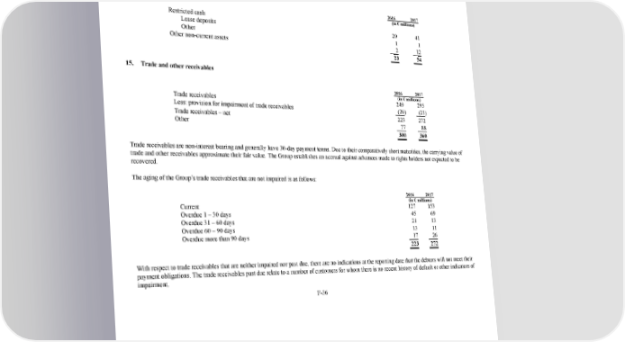 229/264 Notes to the 2017 consolidated financial statements The Group performed its annual impairment test in the fourth quarter of 2017, and concluded that goodwill was not impaired as the fair value of the operating segments significantly exceeded their carrying amounts. 14. Restricted cash and other noncurrent assets 2016 2017 (in € millions) Restricted cash Lease deposits 20 41 Other 1 1 Other noncurrent assets 2 12 23 54 15. Trade and other receivables 2016 2017 (in € millions) Trade receivables 249 295 Less: provision for impairment of trade receivables (26 ) (23 ) Trade receivables – net 223 272 Other 77 88 300 360 Trade receivables are noninterest bearing and generally have 30day payment terms. Due to their comparatively short maturities, the carrying value of trade and other receivables approximate their fair value. The Group establishes an accrual against advances made to rights holders not expected to be recovered. The aging of the Group’s trade receivables that are not impaired is as follows: 2016 2017 (in € millions) Current 127 153 Overdue 1 – 30 days 45 69 Overdue 31 – 60 days 21 13 Overdue 60 – 90 days 13 11 Overdue more than 90 days 17 26 223 272 With respect to trade receivables that are neither impaired nor past due, there are no indications at the reporting date that the debtors will not meet their payment obligations. The trade receivables past due relate to a number of customers for whom there is no recent history of default or other indicators of impairment. F36