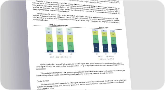 120/264 Our AdSupported Service has grown from €295 million in revenue in 2016 to €416 million in revenue in 2017, representing an increase of 41%. The gross margins in our AdSupported segment also have improved over the years, as the cost of revenue of this business has decreased from 109% in 2016 to 90% of revenue in 2017. Technology innovation and data mining are at the heart of our AdSupported Service. From a technology perspective, we continue to innovate to provide new products for advertisers. We pioneered programmatic audio and have been investing in programmatic advertising since 2015. Programmatic accounted for 18% of total AdSupported revenue across our platform, growing 100% from 2016. Additionally, our recently launched Ad Studio product will increase automation, further allowing both large and small advertisers to utilize our growing selfserve platform. Our ability to harness our data allows us to know our Users. We believe we understand people through music, their mood, mindset, activities, and tastes, and we can serve them relevant advertising catered specifically to them. Our advertising platform is continually moving toward a holistic people based marketing approach that is better for both our Users and our advertisers. There are over 150 billion events logged daily on our Service, helping us learn how best to serve our Users and advertisers. With this level of firstparty data, we are able to use our advanced algorithms to help advertisers serve highly targeted programs to specific Users and audiences. As of December 31, 2017, we believe our 159 million MAUs in 61 countries and territories provide advertisers with an attractive and scaled audience. A large percentage of our AdSupported Users are between 18 and 34 years old. This is a highly soughtafter audience that has traditionally been difficult for advertisers to reach via other channels. Furthermore, our User base is highly engaged, providing firstparty anonymized data that is valuable to advertisers. MAUs by Age Demographic MAUs by Region By offering advertisers increased “selfserve options,” in which they are able to choose their target audiences and demographics, we also are improving the efficiency and scalability of our advertising platform. This option helps improve our margins, as well as our advertising partners’ return on investment. Video products, including mobile video, provide us with additional avenues for more visual advertising which we believe will further strengthen our advertising business, since this is an increasingly popular medium for our advertising partners and the brands they represent. Creator Services The creator services team is responsible for enhancing the growth and success of the creator community through various functions by focusing on audience development, strategy, talent, live events, fan initiatives, and artist marketing. At the core of creator services are fundamental and trusted relationships with artists, 113