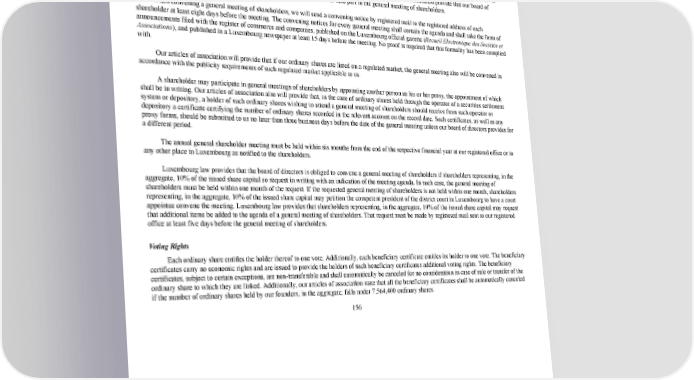 163/264 General Meeting of Shareholders Any regularly constituted general meeting of shareholders represents the entire body of our shareholders. Any holder of our share capital is entitled to attend our general meeting of shareholders, either in person or by proxy, to address the general meeting of shareholders and to exercise voting rights, subject to the provisions of our articles of association. Each ordinary share entitles the holder to one vote at a general meeting of shareholders, unless such holder has a beneficiary certificate. Our articles of association provide that our board of directors may determine all other conditions that must be fulfilled in order to take part in the general meeting of shareholders. When convening a general meeting of shareholders, we will send a convening notice by registered mail to the registered address of each shareholder at least eight days before the meeting. The convening notices for every general meeting shall contain the agenda and shall take the form of announcements filed with the register of commerce and companies, published on the Luxembourg official gazette ( Recueil Electronique des Sociétés et Associations ), and published in a Luxembourg newspaper at least 15 days before the meeting. No proof is required that this formality has been complied with. Our articles of association will provide that if our ordinary shares are listed on a regulated market, the general meeting also will be convened in accordance with the publicity requirements of such regulated market applicable to us. A shareholder may participate in general meetings of shareholders by appointing another person as his or her proxy, the appointment of which shall be in writing. Our articles of association also will provide that, in the case of ordinary shares held through the operator of a securities settlement system or depository, a holder of such ordinary shares wishing to attend a general meeting of shareholders should receive from such operator or depository a certificate certifying the number of ordinary shares recorded in the relevant account on the record date. Such certificates, as well as any proxy forms, should be submitted to us no later than three business days before the date of the general meeting unless our board of directors provides for a different period. The annual general shareholder meeting must be held within six months from the end of the respective financial year at our registered office or in any other place in Luxembourg as notified to the shareholders. Luxembourg law provides that the board of directors is obliged to convene a general meeting of shareholders if shareholders representing, in the aggregate, 10% of the issued share capital so request in writing with an indication of the meeting agenda. In such case, the general meeting of shareholders must be held within one month of the request. If the requested general meeting of shareholders is not held within one month, shareholders representing, in the aggregate, 10% of the issued share capital may petition the competent president of the district court in Luxembourg to have a court appointee convene the meeting. Luxembourg law provides that shareholders representing, in the aggregate, 10% of the issued share capital may request that additional items be added to the agenda of a general meeting of shareholders. That request must be made by registered mail sent to our registered office at least five days before the general meeting of shareholders. Voting Rights Each ordinary share entitles the holder thereof to one vote. Additionally, each beneficiary certificate entitles its holder to one vote. The beneficiary certificates carry no economic rights and are issued to provide the holders of such beneficiary certificates additional voting rights. The beneficiary certificates, subject to certain exceptions, are nontransferable and shall automatically be canceled for no consideration in case of sale or transfer of the ordinary share to which they are linked. Additionally, our articles of association state that all the beneficiary certificates shall be automatically canceled if the number of ordinary shares held by our founders, in the aggregate, falls under 7,564,400 ordinary shares. 156