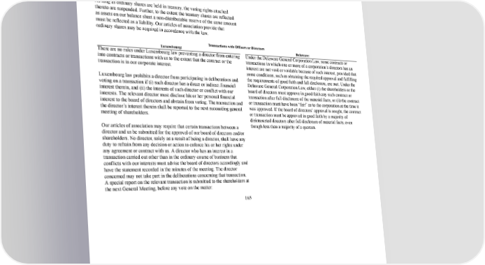 172/264 Repurchases and Redemptions Luxembourg: Delaware: law and are subject to specific provisions on reductions in capital and redeemable shares under Luxembourg law). Any ordinary shares acquired in contravention of the above provisions must be resold within a period of one year after the acquisition or be cancelled at the expiration of the oneyear period. As long as ordinary shares are held in treasury, the voting rights attached thereto are suspended. Further, to the extent the treasury shares are reflected as assets on our balance sheet a nondistributable reserve of the same amount must be reflected as a liability. Our articles of association provide that ordinary shares may be acquired in accordance with the law. Transactions with Officers or Directors Luxembourg: Delaware: There are no rules under Luxembourg law preventing a director from entering into contracts or transactions with us to the extent that the contract or the transaction is in our corporate interest. Luxembourg law prohibits a director from participating in deliberations and voting on a transaction if (i) such director has a direct or indirect financial interest therein, and (ii) the interests of such director or conflict with our interests. The relevant director must disclose his or her personal financial interest to the board of directors and abstain from voting. The transaction and the director’s interest therein shall be reported to the next succeeding general meeting of shareholders. Our articles of association may require that certain transactions between a director and us be submitted for the approval of our board of directors and/or shareholders. No director, solely as a result of being a director, shall have any duty to refrain from any decision or action to enforce his or her rights under any agreement or contract with us. A director who has an interest in a transaction carried out other than in the ordinary course of business that conflicts with our interests must advise the board of directors accordingly and have the statement recorded in the minutes of the meeting. The director concerned may not take part in the deliberations concerning that transaction. A special report on the relevant transaction is submitted to the shareholders at the next General Meeting, before any vote on the matter. Under the Delaware General Corporation Law, some contracts or transactions in which one or more of a corporation’s directors has an interest are not void or voidable because of such interest, provided that some conditions, such as obtaining the required approval and fulfilling the requirements of good faith and full disclosure, are met. Under the Delaware General Corporation Law, either (i) the shareholders or the board of directors must approve in good faith any such contract or transaction after full disclosure of the material facts, or (ii) the contract or transaction must have been “fair” as to the corporation at the time it was approved. If the board of directors’ approval is sought, the contract or transaction must be approved in good faith by a majority of disinterested directors after full disclosure of material facts, even though less than a majority of a quorum. 165