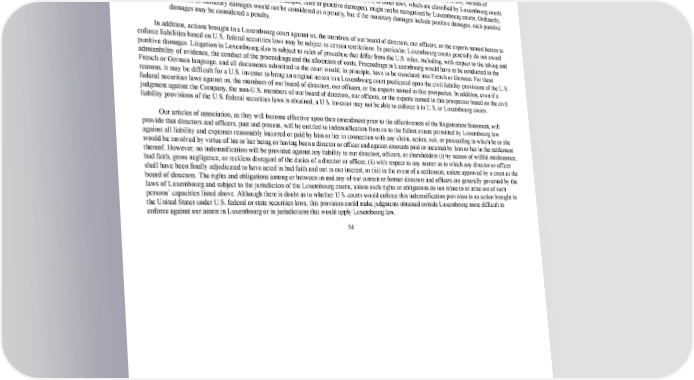 61/264 • the judgment was granted following proceedings where the counterparty had the opportunity to appear and, if it appeared, to present a defense, and the decision of the foreign court must not have been obtained by fraud, but in compliance with the rights of the defendant; • the U.S. court acted in accordance with its own procedural laws; and • the decisions and the considerations of the U.S. court must not be contrary to Luxembourg international public policy rules or have been given in proceedings of a tax or criminal nature or rendered subsequent to an evasion of Luxembourg law ( fraude à la loi ). Awards of damages made under civil liabilities provisions of the U.S. federal securities laws, or other laws, which are classified by Luxembourg courts as being of a penal or punitive nature (for example, fines or punitive damages), might not be recognized by Luxembourg courts. Ordinarily, an award of monetary damages would not be considered as a penalty, but if the monetary damages include punitive damages, such punitive damages may be considered a penalty. In addition, actions brought in a Luxembourg court against us, the members of our board of directors, our officers, or the experts named herein to enforce liabilities based on U.S. federal securities laws may be subject to certain restrictions. In particular, Luxembourg courts generally do not award punitive damages. Litigation in Luxembourg also is subject to rules of procedure that differ from the U.S. rules, including, with respect to the taking and admissibility of evidence, the conduct of the proceedings and the allocation of costs. Proceedings in Luxembourg would have to be conducted in the French or German language, and all documents submitted to the court would, in principle, have to be translated into French or German. For these reasons, it may be difficult for a U.S. investor to bring an original action in a Luxembourg court predicated upon the civil liability provisions of the U.S. federal securities laws against us, the members of our board of directors, our officers, or the experts named in this prospectus. In addition, even if a judgment against the Company, the nonU.S. members of our board of directors, our officers, or the experts named in this prospectus based on the civil liability provisions of the U.S. federal securities laws is obtained, a U.S. investor may not be able to enforce it in U.S. or Luxembourg courts. Our articles of association, as they will become effective upon their amendment prior to the effectiveness of the Registration Statement, will provide that directors and officers, past and present, will be entitled to indemnification from us to the fullest extent permitted by Luxembourg law against all liability and expenses reasonably incurred or paid by him or her in connection with any claim, action, suit, or proceeding in which he or she would be involved by virtue of his or her being or having been a director or officer and against amounts paid or incurred by him or her in the settlement thereof. However, no indemnification will be provided against any liability to our directors, officers, or shareholders (i) by reason of willful misfeasance, bad faith, gross negligence, or reckless disregard of the duties of a director or officer, (ii) with respect to any matter as to which any director or officer shall have been finally adjudicated to have acted in bad faith and not in our interest, or (iii) in the event of a settlement, unless approved by a court or the board of directors. The rights and obligations among or between us and any of our current or former directors and officers are generally governed by the laws of Luxembourg and subject to the jurisdiction of the Luxembourg courts, unless such rights or obligations do not relate to or arise out of such persons’ capacities listed above. Although there is doubt as to whether U.S. courts would enforce this indemnification provision in an action brought in the United States under U.S. federal or state securities laws, this provision could make judgments obtained outside Luxembourg more difficult to enforce against our assets in Luxembourg or in jurisdictions that would apply Luxembourg law. 54