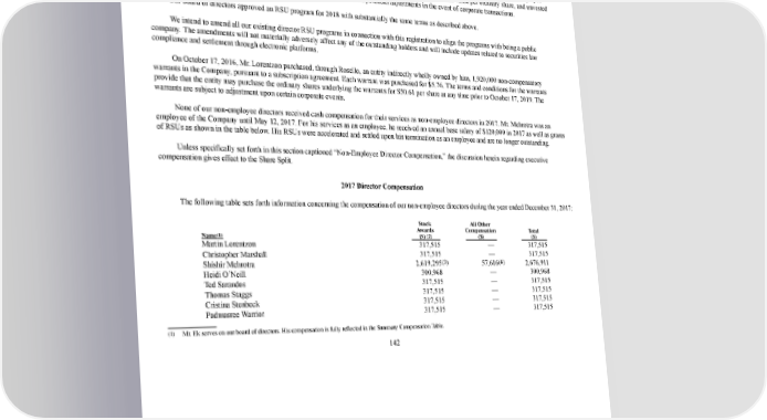 149/264 NonEmployee Director Compensation Similarly to our executive compensation decisions, the remuneration committee bases its decisions regarding nonemployee director compensation, at least in part, by reference to the compensation of the nonemployee directors in the Peer Group. For our nonemployee directors we provide equity compensation in the form of RSUs. We annually grant RSUs to nonemployee members of our board of directors. Each such grant generally vests ratably over four years. The nonemployee director RSUs will fully vest upon the occurrence of a change in control. Like employee RSUs, the RSUs are settled within 30 days following vesting, subject to payment by the holder of the nominal value per ordinary share, and unvested RSUs are forfeited on termination of service. The plans provide for certain potential adjustments in the event of corporate transactions. Our board of directors approved an RSU program for 2018 with substantially the same terms as described above. We intend to amend all our existing director RSU programs in connection with this registration to align the programs with being a public company. The amendments will not materially adversely affect any of the outstanding holders and will include updates related to securities law compliance and settlement through electronic platforms. On October 17, 2016, Mr. Lorentzon purchased, through Rosello, an entity indirectly wholly owned by him, 1,920,000 noncompensatory warrants in the Company, pursuant to a subscription agreement. Each warrant was purchased for $5.76. The terms and conditions for the warrants provide that the entity may purchase the ordinary shares underlying the warrants for $50.61 per share at any time prior to October 17, 2019. The warrants are subject to adjustment upon certain corporate events. None of our nonemployee directors received cash compensation for their services as nonemployee directors in 2017. Mr. Mehrotra was an employee of the Company until May 12, 2017. For his services as an employee, he received an annual base salary of $120,000 in 2017 as well as grants of RSUs as shown in the table below. His RSUs were accelerated and settled upon his termination as an employee and are no longer outstanding. Unless specifically set forth in this section captioned “NonEmployee Director Compensation,” the discussion herein regarding executive compensation gives effect to the Share Split. 2017 Director Compensation The following table sets forth information concerning the compensation of our nonemployee directors during the year ended December 31, 2017: Name ( 1 ) Stock Awards ($) ( 2 ) All Other Compensation ($) Total ($) Martin Lorentzon 317,515 — 317,515 Christopher Marshall 317,515 — 317,515 Shishir Mehrotra 2,619,295 (3) 57,616 (4) 2,676,911 Heidi O’Neill 300,968 — 300,968 Ted Sarandos 317,515 — 317,515 Thomas Staggs 317,515 — 317,515 Cristina Stenbeck 317,515 — 317,515 Padmasree Warrior 317,515 — 317,515 ( 1 ) Mr. Ek serves on our board of directors. His compensation is fully reflected in the Summary Compensation Table. 142