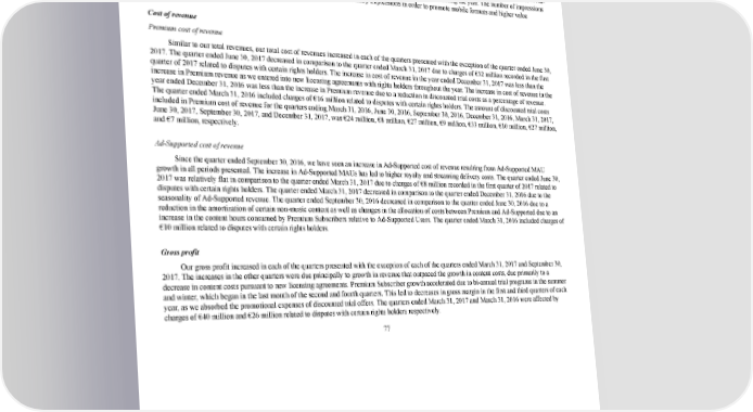 84/264 AdSupported business revenue Our AdSupported revenues increased in each of the quarters presented with the exception of a decrease in the quarter ended March 31, 2017 due to seasonality. AdSupported revenue was typically the highest in the fourth quarter of each year due to greater advertising demand during the holiday season. The increase in AdSupported revenue throughout the year ended December 31, 2017 was due primarily to increases in the number of impressions sold, driven largely by the growth in our programmatic channel. In the year ended December 31, 2016, there were quarterly increases in Ad Supported revenue due primarily to increases in average rates per impression based on the product mix sold during the year. The number of impressions sold was consistent with the previous year. We curtailed the number of desktop impressions in order to promote mobile formats and higher value desktop placements. Cost of revenue Premium cost of revenue Similar to our total revenues, our total cost of revenues increased in each of the quarters presented with the exception of the quarter ended June 30, 2017. The quarter ended June 30, 2017 decreased in comparison to the quarter ended March 31, 2017 due to charges of €32 million recorded in the first quarter of 2017 related to disputes with certain rights holders. The increase in cost of revenue in the year ended December 31, 2017 was less than the increase in Premium revenue as we entered into new licensing agreements with rights holders throughout the year. The increase in cost of revenue in the year ended December 31, 2016 was less than the increase in Premium revenue due to a reduction in discounted trial costs as a percentage of revenue. The quarter ended March 31, 2016 included charges of €16 million related to disputes with certain rights holders. The amount of discounted trial costs included in Premium cost of revenue for the quarters ending March 31, 2016, June 30, 2016, September 30, 2016, December 31, 2016, March 31, 2017, June 30, 2017, September 30, 2017, and December 31, 2017, was €24 million, €8 million, €27 million, €9 million, €33 million, €10 million, €27 million, and €7 million, respectively. AdSupported cost of revenue Since the quarter ended September 30, 2016, we have seen an increase in AdSupported cost of revenue resulting from AdSupported MAU growth in all periods presented. The increase in AdSupported MAUs has led to higher royalty and streaming delivery costs. The quarter ended June 30, 2017 was relatively flat in comparison to the quarter ended March 31, 2017 due to charges of €8 million recorded in the first quarter of 2017 related to disputes with certain rights holders. The quarter ended March 31, 2017 decreased in comparison to the quarter ended December 31, 2016 due to the seasonality of AdSupported revenue. The quarter ended September 30, 2016 decreased in comparison to the quarter ended June 30, 2016 due to a reduction in the amortization of certain nonmusic content as well as changes in the allocation of costs between Premium and AdSupported due to an increase in the content hours consumed by Premium Subscribers relative to AdSupported Users. The quarter ended March 31, 2016 included charges of €10 million related to disputes with certain rights holders. Gross profit Our gross profit increased in each of the quarters presented with the exception of each of the quarters ended March 31, 2017 and September 30, 2017. The increases in the other quarters were due principally to growth in revenue that outpaced the growth in content costs, due primarily to a decrease in content costs pursuant to new licensing agreements. Premium Subscriber growth accelerated due to biannual trial programs in the summer and winter, which began in the last month of the second and fourth quarters. This led to decreases in gross margin in the first and third quarters of each year, as we absorbed the promotional expenses of discounted trial offers. The quarters ended March 31, 2017 and March 31, 2016 were affected by charges of €40 million and €26 million related to disputes with certain rights holders respectively. 77