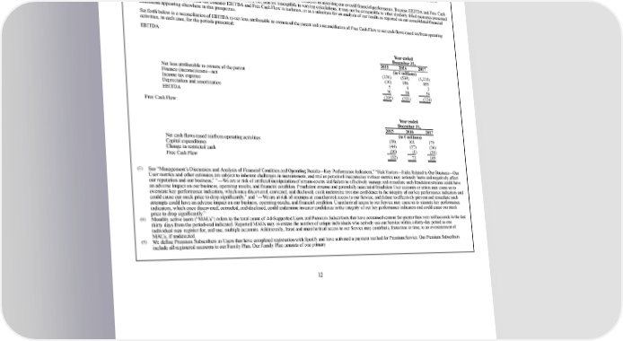 19/264 purposes, including the preparation of our annual operating budget and financial projections. EBITDA has limitations as an analytical tool. EBITDA should not be construed as an inference that our future results will be unaffected by unusual or nonrecurring items. Additionally, EBITDA is not intended to be a measure of discretionary cash to invest in the growth of our business, as it does not reflect tax payments, debt service requirements, capital expenditures, and certain other cash costs that may recur in the future. Management compensates for these limitations by relying on our results reported under IFRS as issued by IASB in addition to using EBITDA supplementally. We define “Free Cash Flow” as net cash flows (used in)/from operating activities less capital expenditures and change in restricted cash. We believe Free Cash Flow is a useful supplemental financial measure for us and investors in assessing our ability to pursue business opportunities and investments and to service our debt. Free Cash Flow is not a measure of our liquidity under IFRS and should not be considered as an alternative to net cash flows (used in)/from operating activities. EBITDA and Free Cash Flow are nonIFRS measures and are not a substitute for IFRS measures in assessing our overall financial performance. Because EBITDA and Free Cash Flow are not measurements determined in accordance with IFRS, and are susceptible to varying calculations, it may not be comparable to other similarly titled measures presented by other companies. You should not consider EBITDA and Free Cash Flow in isolation, or as a substitute for an analysis of our results as reported on our consolidated financial statements appearing elsewhere in this prospectus. Set forth below is a reconciliation of EBITDA to net loss attributable to owners of the parent and a reconciliation of Free Cash Flow to net cash flows (used in)/from operating activities, in each case, for the periods presented: EBITDA: Year ended December 31, 2015 2016 2017 (in € millions) Net loss attributable to owners of the parent (230 ) (539 ) (1,235 ) Finance (income)/costs—net (10 ) 186 855 Income tax expense 5 4 2 Depreciation and amortization 30 38 54 EBITDA (205 ) (311 ) (324 ) Free Cash Flow: Year ended December 31, 2015 2016 2017 (in € millions) Net cash flows (used in)/from operating activities (38 ) 101 179 Capital expenditures (44 ) (27 ) (36 ) Change in restricted cash (10 ) (1 ) (34 ) Free Cash Flow (92 ) 73 109 ( 3 ) See “Management’s Discussion and Analysis of Financial Condition and Operating Results—Key Performance Indicators,” “Risk Factors—Risks Related to Our Business—Our User metrics and other estimates are subject to inherent challenges in measurement, and real or perceived inaccuracies in those metrics may seriously harm and negatively affect our reputation and our business,” “—We are at risk of artificial manipulation of stream counts and failure to effectively manage and remediate such fraudulent streams could have an adverse impact on our business, operating results, and financial condition. Fraudulent streams and potentially associated fraudulent User accounts or artists may cause us to overstate key performance indicators, which once discovered, corrected, and disclosed, could undermine investor confidence in the integrity of our key performance indicators and could cause our stock price to drop significantly,” and “—We are at risk of attempts at unauthorized access to our Service, and failure to effectively prevent and remediate such attempts could have an adverse impact on our business, operating results, and financial condition. Unauthorized access to our Service may cause us to misstate key performance indicators, which once discovered, corrected, and disclosed, could undermine investor confidence in the integrity of our key performance indicators and could cause our stock price to drop significantly.” ( 4 ) Monthly active users (“MAUs”) refers to the total count of AdSupported Users and Premium Subscribers that have consumed content for greater than zero milliseconds in the last thirty days from the periodend indicated. Reported MAUs may overstate the number of unique individuals who actively use our Service within a thirtyday period as one individual may register for, and use, multiple accounts. Additionally, fraud and unauthorized access to our Service may contribute, from time to time, to an overstatement of MAUs, if undetected. ( 5 ) We define Premium Subscribers as Users that have completed registration with Spotify and have activated a payment method for Premium Service. Our Premium Subscribers include all registered accounts in our Family Plan. Our Family Plan consists of one primary 12