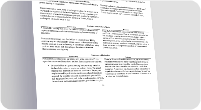 170/264 Shareholder Approval of Business Combinations Luxembourg: Delaware: Under Luxembourg law and our articles of association, the board of directors has the widest power to take any action necessary or useful to achieve the corporate objective. The board of directors’ powers are limited only by law and our articles of association. Any type of business combination that would require an amendment to the articles of association, such as a merger, demerger, consolidation, dissolution, or voluntary liquidation, requires an extraordinary resolution of a general meeting of shareholders. Transactions such as a sale, lease, or exchange of substantial company assets require only the approval of the board of directors. Neither Luxembourg law nor our articles of association contain any provision specifically requiring the board of directors to obtain shareholder approval of the sale, lease, or exchange of substantial assets of ours. Generally, under the Delaware General Corporation Law, completion of a merger, consolidation, dissolution, or the sale, lease, or exchange of substantially all of a corporation’s assets requires approval by the board of directors and by a majority (unless the certificate of incorporation requires a higher percentage) of outstanding stock of the corporation entitled to vote. The Delaware General Corporation Law also requires a special vote of shareholders in connection with a business combination with an “interested shareholder” as defined in section 203 of the Delaware General Corporation Law. See “—Interested Shareholders” above. Shareholder Action Without a Meeting Luxembourg: Delaware: A shareholder meeting must always be called if the matter to be considered requires a shareholder resolution under Luxembourg law or our articles of association. Pursuant to Luxembourg law, shareholders of a public limited liability company may not take actions by written consent. All shareholder actions must be approved at an actual meeting of shareholders held before a notary public or under private seal, depending on the nature of the matter. Shareholders may vote by proxy. Under the Delaware General Corporation Law, unless otherwise provided in a corporation’s certificate of incorporation, any action that may be taken at a meeting of shareholders may be taken without a meeting, without prior notice, and without a vote if the holders of outstanding stock, having not less than the minimum number of votes that would be necessary to authorize such action, consent in writing. It is not uncommon for a corporation’s certificate of incorporation to prohibit such action. Repurchases and Redemptions Luxembourg: Delaware: Pursuant to Luxembourg law, we (or any party acting on our behalf) may repurchase our own ordinary shares and hold them in treasury, provided that: • the shareholders at a general meeting have previously authorized the board of directors to acquire our ordinary shares. The general meeting shall determine the terms and conditions of the proposed acquisition and in particular the maximum number of shares to be acquired, the period for which the authorization is given (which may not exceed five years), and, in the case of acquisition for value, the maximum and minimum consideration, provided that the prior Under the Delaware General Corporation Law, any corporation may purchase or redeem its own shares, except that generally it may not purchase or redeem these shares if the capital of the corporation is impaired at the time or would become impaired as a result of the redemption. A corporation may, however, purchase or redeem out of capital shares that are entitled upon any distribution of its assets to a preference over another class or series of its shares if the shares are to be retired and the capital reduced. 163
