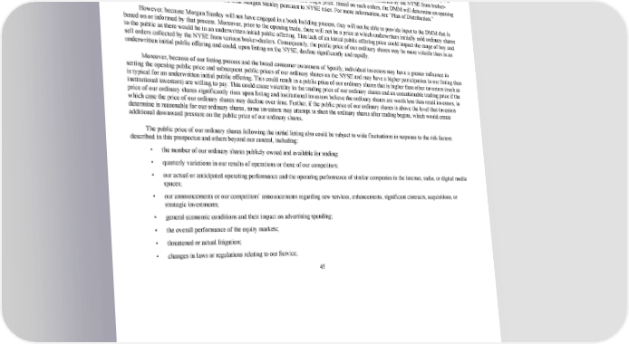 52/264 The public price of our ordinary shares may be volatile, and could, upon listing on the NYSE, decline significantly and rapidly. As this listing is taking place via a novel process that is not an underwritten initial public offering, there will be no book building process and no price at which underwriters initially sold shares to the public to help inform efficient price discovery with respect to the opening trades on the NYSE. Pursuant to NYSE Rules, we have engaged Morgan Stanley & Co. LLC (“Morgan Stanley”) as a financial advisor to be available to consult with the designated market maker (the “DMM”) in setting the opening public price of our ordinary shares on the NYSE. Based on information provided by the NYSE, the opening public price of our ordinary shares on the NYSE will be determined by buy and sell orders collected by the NYSE from broker dealers and the NYSE is where buy orders can be matched with sell orders at a single price. Based on such orders, the DMM will determine an opening price for our ordinary shares in consultation with Morgan Stanley pursuant to NYSE rules. For more information, see “Plan of Distribution.” However, because Morgan Stanley will not have engaged in a book building process, they will not be able to provide input to the DMM that is based on or informed by that process. Moreover, prior to the opening trade, there will not be a price at which underwriters initially sold ordinary shares to the public as there would be in an underwritten initial public offering. This lack of an initial public offering price could impact the range of buy and sell orders collected by the NYSE from various brokerdealers. Consequently, the public price of our ordinary shares may be more volatile than in an underwritten initial public offering and could, upon listing on the NYSE, decline significantly and rapidly. Moreover, because of our listing process and the broad consumer awareness of Spotify, individual investors may have a greater influence in setting the opening public price and subsequent public prices of our ordinary shares on the NYSE and may have a higher participation in our listing than is typical for an underwritten initial public offering. This could result in a public price of our ordinary shares that is higher than other investors (such as institutional investors) are willing to pay. This could cause volatility in the trading price of our ordinary shares and an unsustainable trading price if the price of our ordinary shares significantly rises upon listing and institutional investors believe the ordinary shares are worth less than retail investors, in which case the price of our ordinary shares may decline over time. Further, if the public price of our ordinary shares is above the level that investors determine is reasonable for our ordinary shares, some investors may attempt to short the ordinary shares after trading begins, which would create additional downward pressure on the public price of our ordinary shares. The public price of our ordinary shares following the initial listing also could be subject to wide fluctuations in response to the risk factors described in this prospectus and others beyond our control, including: • the number of our ordinary shares publicly owned and available for trading; • quarterly variations in our results of operations or those of our competitors; • our actual or anticipated operating performance and the operating performance of similar companies in the internet, radio, or digital media spaces; • our announcements or our competitors’ announcements regarding new services, enhancements, significant contracts, acquisitions, or strategic investments; • general economic conditions and their impact on advertising spending; • the overall performance of the equity markets; • threatened or actual litigation; • changes in laws or regulations relating to our Service; 45