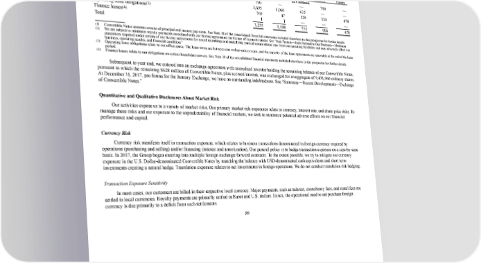 96/264 Tabular disclosure of contractual obligations The following table sets forth our contractual obligations and commercial commitments as of December 31, 2017: Payments due by period Contractual obligations: Total Less than 1 year 13 years 35 years More than 5 years (in € millions) Convertible Notes (1) 790 — — 790 — Minimum guarantees (2) 1,695 1,060 635 — — Operating lease obligations (3) 769 47 120 124 478 Finance leases (4) 1 1 — — — Total 3,255 1,108 755 914 478 ( 1 ) Convertible Notes amounts consist of principal and interest payments. See Note 18 of the consolidated financial statements included elsewhere in this prospectus for further details. ( 2 ) We are subject to minimum royalty payments associated with our license agreements for the use of licensed content. See “Risk Factors—Risks Related to Our Business—Minimum guarantees required under certain of our license agreements for sound recordings and underlying musical compositions may limit our operating flexibility and may adversely affect our business, operating results, and financial condition.” ( 3 ) Operating lease obligations relate to our office space. The lease terms are between one and seventeen years, and the majority of the lease agreements are renewable at the end of the lease period. ( 4 ) Finance leases relate to our obligations on certain leased dataservers. See Note 18 of the consolidated financial statements included elsewhere in this prospectus for further details. Subsequent to year end, we entered into an exchange agreement with accredited investor holding the remaining balance of our Convertible Notes, pursuant to which the remaining $628 million of Convertible Notes, plus accrued interest, was exchanged for an aggregate of 9,431,960 ordinary shares. At December 31, 2017, pro forma for the January Exchange, we have no outstanding indebtedness. See “Summary—Recent Developments—Exchange of Convertible Notes.” Quantitative and Qualitative Disclosures About Market Risk Our activities expose us to a variety of market risks. Our primary market risk exposures relate to currency, interest rate, and share price risks. To manage these risks and our exposure to the unpredictability of financial markets, we seek to minimize potential adverse effects on our financial performance and capital. Currency Risk Currency risk manifests itself in transaction exposure, which relates to business transactions denominated in foreign currency required by operations (purchasing and selling) and/or financing (interest and amortization). Our general policy is to hedge transaction exposure on a casebycase basis. In 2017, the Group began entering into multiple foreign exchange forward contracts. To the extent possible, we try to mitigate our currency exposure in the U.S. Dollardenominated Convertible Notes by matching the balance with USDdenominated cash equivalents and short term investments creating a natural hedge. Translation exposure relates to net investments in foreign operations. We do not conduct translation risk hedging. Transaction Exposure Sensitivity In most cases, our customers are billed in their respective local currency. Major payments, such as salaries, consultancy fees, and rental fees are settled in local currencies. Royalty payments are primarily settled in Euros and U.S. dollars. Hence, the operational need to net purchase foreign currency is due primarily to a deficit from such settlements. 89