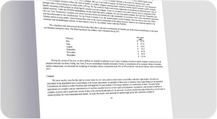 90/264 • the economic and competitive environment, including the industry in which we operate; and • thirdparty valuations of our ordinary shares. The fair value of our ordinary shares is determined using recent secondary market transactions in our ordinary shares and the Probability Weighted Expected Return Method (“PWERM”), which is one of the recommended valuation methods to measure fair value in privately held companies with complex equity structures in the American Institute of Certified Public Accountants Practice Guide, Valuation of PrivatelyHeldCompany Equity Securities Issued as Compensation. We first used the Market Approach, Guideline Company Method, to determine the indicated equity value considering four scenarios: the High Case Public Company, the Low Case Public Company, the High Case Transaction, and the Low Case Transaction. The public company scenarios reflect the value of Spotify as a public company and encompass scenarios whereby Spotify becomes a public company through either a direct listing or an initial public offering. We then used the Market and Income Approaches to determine the indicated equity value of Spotify assuming a fifth scenario in which Spotify remains a private company. These five scenarios were used to allocate value to components of the capital structure. Under the PWERM methodology, for the High Case public company, the Low Case public company, the High Case Transaction, and the Low Case Transaction, Company exit values were determined and distributed to the shareholders in accordance with various shareholder agreements and then discounted to the valuation date. For the Private Company Case, the scenariobased current Company value was used as input into a Black Scholes option pricing model, which allocated this value to the various components of the capital structure. Based on the weightings applied to the scenarios and methodologies utilized, we determined a value for the ordinary shares under the PWERM. The valuations took into account the factors described above and used a combination of financial and marketbased methodologies to determine our business enterprise value. The following details the ordinary share valuations during 2017. Fair market value February $ 50.70 May $ 65.50 June $ 69.03 August $ 78.25 September $ 87.68 November $ 90.65 December $ 120.50 During the course of the year, we have shifted our scenario weightings to give higher weighting towards our public company scenarios given the progress towards our direct listing. See Note 22 to our consolidated financial statements. Further, in consideration of an increased volume in secondary market transactions, we increased the weighting of secondary market transactions from 20% to 50% of the fair value of our ordinary shares in December 2017. Content We incur royalty costs for the right to stream music to our Users, paid to certain music record labels and other rights holders. Royalties are calculated using negotiated rates in accordance with license agreements, or estimates of those rates in instances where rights holders are not identified. Calculations are based on either Premium and AdSupported revenue earned or User/usage measures or a combination of these. The rights holder agreements are complex and our determination of royalties payable involves certain significant judgments, assumptions, and estimates in addition to complex systems and a significant volume of data to be processed and analyzed. In particular, in certain jurisdictions rights holders have several years to claim royalties for works streamed each month. As such, the royalty costs incurred in a period might not be fully settled for a number of 83