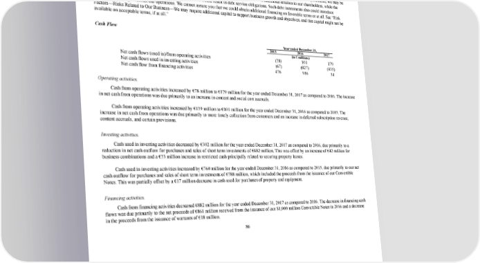 93/264 We believe our existing cash and cash equivalent balances and the cash flow we generate from our operations will be sufficient to meet our working capital and capital expenditure needs for at least the next 12 months. However, our future capital requirements may be materially different than those currently planned in our budgeting and forecasting activities and depend on many factors, including our rate of revenue growth, the timing and extent of spending on content and research and development, the expansion of our sales and marketing activities, the timing of new product introductions, market acceptance of our products, our continued international expansion, competitive factors, and overall economic conditions, globally. To the extent that current and anticipated future sources of liquidity are insufficient to fund our future business activities and requirements, we may be required to seek additional equity or debt financing. The sale of additional equity would result in additional dilution to our shareholders, while the incurrence of debt financing or additional convertible debt would result in debt service obligations. Such debt instruments also could introduce covenants that might restrict our operations. We cannot assure you that we could obtain additional financing on favorable terms or at all. See “Risk Factors—Risks Related to Our Business—We may require additional capital to support business growth and objectives, and this capital might not be available on acceptable terms, if at all.” Cash Flow Year ended December 31, 2015 2016 2017 (in € millions) Net cash flows (used in)/from operating activities (38 ) 101 179 Net cash flows used in investing activities (67 ) (827 ) (435 ) Net cash flow from financing activities 476 916 34 Operating activities. Cash from operating activities increased by €78 million to €179 million for the year ended December 31, 2017 as compared to 2016. The increase in net cash from operations was due primarily to an increase in content and social cost accruals. Cash from operating activities increased by €139 million to €101 million for the year ended December 31, 2016 as compared to 2015. The increase in net cash from operations was due primarily to more timely collection from customers and an increase in deferred subscription revenue, content accruals, and certain provisions. Investing activities. Cash used in investing activities decreased by €392 million for the year ended December 31, 2017 as compared to 2016, due primarily to a reduction in net cash outflow for purchases and sales of short term investments of €482 million. This was offset by an increase of €42 million for business combinations and a €33 million increase in restricted cash principally related to securing property leases. Cash used in investing activities increased by €760 million for the year ended December 31, 2016 as compared to 2015, due primarily to our net cash outflow for purchases and sales of short term investments of €788 million, which included the proceeds from the issuance of our Convertible Notes. This was partially offset by a €17 million decrease in cash used for purchases of property and equipment. Financing activities. Cash from financing activities decreased €882 million for the year ended December 31, 2017 as compared to 2016. The decrease in financing cash flows was due primarily to the net proceeds of €861 million received from the issuance of our $1,000 million Convertible Notes in 2016 and a decrease in the proceeds from the issuance of warrants of €18 million. 86