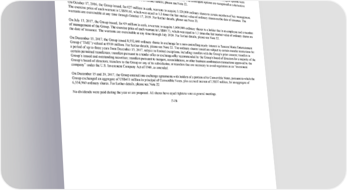 231/264 Notes to the 2017 consolidated financial statements On April 17, June 9, and July 15, 2015, the Group entered into an equity financing agreement with new and existing shareholders for the issuance of 9,484,880 ordinary shares for total gross proceeds of €479 million and incurred transaction costs of €5 million. In addition to the shares received, the new investors also received contingent options that provided downside protection (meaning that the new investors are eligible to receive additional shares at certain valuations in the event of certain triggering events such as a trade sale, public listing, or liquidation). The contingent options were determined to be embedded derivatives, which required separation from the equity issuance. The contingent options are recognized as a derivative liability and were valued at €87 million upon issuance. For further details, please see Note 22. On October 17, 2016, the Group issued, for €27 million in cash, warrants to acquire 5,120,000 ordinary shares to certain members of key management. The exercise price of each warrant is US$50.61, which was equal to 1.2 times the fair market value of ordinary shares on the date of issuance. The warrants are exercisable at any time through October 17, 2019. For further details, please see Note 22. On July 13, 2017, the Group issued, for €9 million in cash, a warrant to acquire 1,600,000 ordinary shares to a holder that is an employee and a member of management of the Group. The exercise price of each warrant is US$89.73, which was equal to 1.3 times the fair market value of ordinary shares on the date of issuance. The warrants are exercisable at any time through July 2020. For further details, please see Note 22. On December 15, 2017, the Group issued 8,552,440 ordinary shares in exchange for a noncontrolling equity interest in Tencent Music Entertainment Group (“TME”) valued at €910 million. For further details, please see Note 22. The ordinary shares issued are subject to certain transfer restrictions for a period of up to three years from December 15, 2017, subject to limited exceptions, including transfers with the Group’s prior consent; transfers to certain permitted transferees; transfers pursuant to a tender offer or exchange offer recommended by the Group’s board of directors for a majority of the Group’s issued and outstanding securities; transfers pursuant to mergers, consolidations, or other business combination transactions approved by the Group’s board of directors; transfers to the Group or any of its subsidiaries; or transfers that are necessary to avoid regulation as an “investment company” under the U.S. Investment Company Act of 1940, as amended. On December 15 and 29, 2017, the Group entered into exchange agreements with holders of a portion of its Convertible Notes, pursuant to which the Group exchanged an aggregate of US$411 million in principal of Convertible Notes, plus accrued interest of US$37 million, for an aggregate of 6,554,960 ordinary shares. For further details, please see Note 22. No dividends were paid during the year or are proposed. All shares have equal rights to vote at general meetings. F38