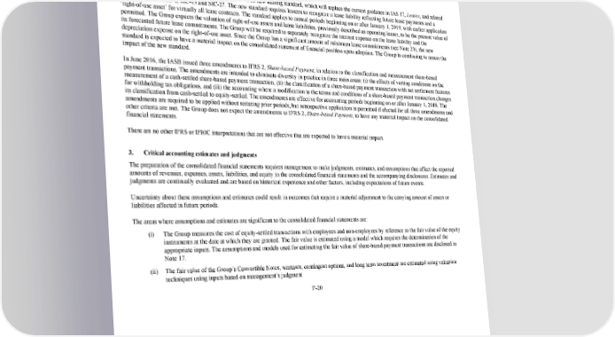 213/264 Notes to the 2017 consolidated financial statements restatement of comparative information may only be done if possible without the use of hindsight. Upon adoption, the Group will designate its long term investment as an equity instrument measured at fair value through other comprehensive income with gains and losses remaining in other comprehensive income without recycling to profit or loss upon derecognition. Upon adoption on January 1, 2018, the Group does not expect IFRS 9, Financial Instruments to have any additional material impact on the consolidated financial statements. In January 2016, the IASB published IFRS 16, Leases , its new leasing standard, which will replace the current guidance in IAS 17, Leases , and related interpretations IFRIC 4, SIC15 and SIC27. The new standard requires lessees to recognize a lease liability reflecting future lease payments and a ‘rightofuse asset’ for virtually all lease contracts. The standard applies to annual periods beginning on or after January 1, 2019, with earlier application permitted. The Group expects the valuation of rightofuse assets and lease liabilities, previously described as operating leases, to be the present value of its forecasted future lease commitments. The Group will be required to separately recognize the interest expense on the lease liability and the depreciation expense on the rightofuse asset. Since the Group has a significant amount of minimum lease commitments (see Note 23), the new standard is expected to have a material impact on the consolidated statement of financial position upon adoption. The Group is continuing to assess the impact of the new standard. In June 2016, the IASB issued three amendments to IFRS 2, Sharebased Payment , in relation to the classification and measurement sharebased payment transactions. The amendments are intended to eliminate diversity in practice in three main areas: (i) the effects of vesting conditions on the measurement of a cashsettled sharebased payment transaction, (ii) the classification of a sharebased payment transaction with net settlement features for withholding tax obligations, and (iii) the accounting where a modification to the terms and conditions of a sharebased payment transaction changes its classification from cashsettled to equitysettled. The amendments are effective for accounting periods beginning on or after January 1, 2018. The amendments are required to be applied without restating prior periods, but retrospective application is permitted if elected for all three amendments and other criteria are met. The Group does not expect the amendments to IFRS 2, Sharebased Payment , to have any material impact on the consolidated financial statements. There are no other IFRS or IFRIC interpretations that are not effective that are expected to have a material impact. 3. Critical accounting estimates and judgments The preparation of the consolidated financial statements requires management to make judgments, estimates, and assumptions that affect the reported amounts of revenues, expenses, assets, liabilities, and equity in the consolidated financial statements and the accompanying disclosures. Estimates and judgments are continually evaluated and are based on historical experience and other factors, including expectations of future events. Uncertainty about these assumptions and estimates could result in outcomes that require a material adjustment to the carrying amount of assets or liabilities affected in future periods. The areas where assumptions and estimates are significant to the consolidated financial statements are: (i) The Group measures the cost of equitysettled transactions with employees and nonemployees by reference to the fair value of the equity instruments at the date at which they are granted. The fair value is estimated using a model which requires the determination of the appropriate inputs. The assumptions and models used for estimating the fair value of sharebased payment transactions are disclosed in Note 17. (ii) The fair value of the Group’s Convertible Notes, warrants, contingent options, and long term investment are estimated using valuation techniques using inputs based on management’s judgment F20