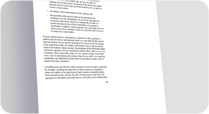 171/264 Repurchases and Redemptions Luxembourg: Delaware: authorization shall not apply in the case of ordinary shares acquired by either us or by a person acting in his or her own name but our behalf for the distribution thereof to our staff or to the staff of a company with which we are in a control relationship; • the acquisitions, including ordinary shares previously acquired by us and held by us and shares acquired by a person acting in his or her own name but on our behalf, may not have the effect of reducing the net assets below the amount of the issued share capital plus the reserves (which may not be distributed by law or under the articles of association); • the ordinary shares repurchased are fully paidup; and • the acquisition offer must be made on the same terms and conditions to all the shareholders who are in the same position, except for acquisitions which were unanimously decided by a general meeting at which all the shareholders were present or represented. In addition, listed companies may repurchase their own shares on the stock exchange without an acquisition offer having to be made to our shareholders. No prior authorization by shareholders is required (i) if the acquisition is made to prevent serious and imminent harm to us, provided that the board of directors informs the next general meeting of the reasons for and the purpose of the acquisitions made, the number and nominal values or the accounting value of the ordinary shares acquired, the proportion of the subscribed capital which they represent, and the consideration paid for them, and (ii) in the case of ordinary shares acquired by either us or by a person acting on our behalf with a view to redistributing the ordinary shares to our staff or our controlled subsidiaries, provided that the distribution of such shares is made within 12 months from their acquisition. Luxembourg law provides for further situations in which the above conditions do not apply, including the acquisition of shares pursuant to a decision to reduce our capital or the acquisition of shares issued as redeemable shares. Such acquisitions may not have the effect of reducing net assets below the aggregate of subscribed capital and reserves (which may not be distributed by 164
