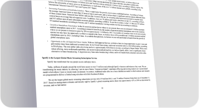 102/264 reaching $4.6 billion, while physical sales and digital download revenues continued to decline at 8% and 21% respectively, according to management estimates and industry reports. • Streaming is Growing Globally. According to management estimates and industry reports, the return to growth in the recorded music industry was seen in every region measured, namely North America, Europe, Asia, and Latin America. By transforming user behavior, streaming has become the dominant global format in the music industry, fueling growth in key music markets worldwide. • The Streaming Market is Still in its Infancy. While streaming has changed the way many people access music, we believe there is an untapped global audience with significant growth potential. Other internet platforms have shown that they can achieve global scale, including Facebook with an estimated 2.0 billion users and YouTube with an estimated 1.5 billion users, according to industry reports. We believe the universality of music gives us the opportunity to reach many of the over 3.6 billion internet users globally, according to the International Telecom Union ICT Facts and Figures 2017 Report. • Increasing Penetration of Established Markets. There is opportunity for growth, even in more established markets. According to Nielsen, the average American listens to more than 32 hours of music each week, and we believe there is significant room to capture additional share of these content hours. Research from MIDiA indicates that listeners who pay for streaming subscription services tend to consume more content hours on average than adsupported users. In addition, there are 30 million paid music subscribers in the U.S., according to RIAA, and 163 million users of paid subscription accounts globally, according to MIDiA. To put this in context, in the U.S. there are 115 million TVenabled households according to Nielsen, and 51 million households viewing content overthetop according to comScore. • Growth in Smartphone Penetration. In the 61 countries and territories where we are present, there were an estimated 1.2 billion payment enabled smartphone users in 2017. According to research from Ovum, the number of paymentenabled smartphone users in the countries where we are present is forecast to grow by 28% to approximately 1.6 billion by 2021. In a number of countries where we do not currently operate but may have the opportunity in which to expand in the future, we believe there will be an additional 1.4 billion paymentenabled smartphone users by 2021, excluding China. As a mobilefirst platform, we believe we are wellpositioned to benefit from the growth in global smartphone users. • Opportunity in the AdSupported Music Market. With our AdSupported Service, we believe there is a large opportunity to grow Users and gain market share from traditional terrestrial radio. In the United States alone, traditional terrestrial radio is a $14 billion market, according to BIA/Kelsey. The total global radio advertising market is approximately $28 billion in revenue, according to Magna Global. With a more robust offering, more ondemand capabilities, and access to personalized playlists, we believe Spotify offers Users a significantly better alternative to linear broadcasting. A migration away from radio broadcasting is likely and it will benefit both consumers and artists alike. Spotify is the Largest Global Music Streaming Subscription Service Spotify has transformed the way people access and enjoy music. Today, millions of people around the world have access to over 35 million tracks through Spotify whenever and wherever they want. We are transforming the music industry by allowing Users to move from a “transactionbased” experience of buying and owning music to an “accessbased” model which allows Users to stream music on demand. In contrast, traditional radio relies on a linear distribution model in which stations and channels are programmed to deliver a limited song selection with little freedom of choice. We are the largest global music streaming subscription service with 159 million MAUs and 71 million Premium Subscribers as of December 31, 2017. Based on management estimates and industry reports, Spotify’s global streaming market share was approximately 42% in 2016 as determined by revenue, and we had market 95