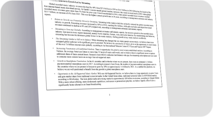 9/264 years ended December 31, 2015, 2016, and 2017, we incurred net losses of €230 million, €539 million, and €1,235 million, respectively. For the years ended December 31, 2015, 2016, and 2017, our EBITDA was €(205) million, €(311) million, and €(324) million, respectively. For the years ended December 31, 2015, 2016, and 2017, our net cash flow (used in)/from operating activities was €(38) million, €101 million, and €179 million, respectively. For the years ended December 31, 2015, 2016, and 2017, our Free Cash Flow was €(92) million, €73 million, and €109 million, respectively. EBITDA and Free Cash Flow are nonIFRS financial measures. For a discussion of EBITDA and Free Cash Flow and a reconciliation of each to their most closely comparable IFRS measures, see “Summary Consolidated Financial and Other Data.” Music Industry Returns to Growth Led by Streaming Global recorded music industry revenues declined by 40% from $23.8 billion in 1999 to $14.3 billion in 2014 following the launch of the first internetbased music download service. As Spotify’s access model gained traction, however, that trend reversed itself in 2015 when global recorded music revenues grew more than 3% from the prior year. Growth accelerated in 2016, when global recorded music revenues reached $15.7 billion, an increase of 6% from 2015. This was the highest annual growth rate in 20 years, according to management estimates and industry reports. • Return to Growth was Primarily Driven by Streaming. Streaming is the engine which has primarily restored the global recorded music industry to growth. Streaming revenues increased by 60% in 2016, reaching $4.6 billion, while physical sales and digital download revenues continued to decline at 8% and 21% respectively, according to management estimates and industry reports. • Streaming is Growing Globally. According to management estimates and industry reports, the return to growth in the recorded music industry was seen in every region measured, namely North America, Europe, Asia, and Latin America. By transforming user behavior, streaming has become the dominant global format in the music industry, fueling growth in key music markets worldwide. • The Streaming Market is Still in its Infancy. While streaming has changed the way many people access music, we believe there is an untapped global audience with significant growth potential. We believe the universality of music gives us the opportunity to reach many of the over 3.6 billion internet users globally, according to the International Telecom Union ICT Facts and Figures 2017 Report. • Increasing Penetration of Established Markets. There is opportunity for growth, even in more established markets. According to Nielsen, the average American listens to more than 32 hours of music each week, and we believe there is significant room to capture additional share of these content hours. Research from MIDiA indicates that listeners who pay for streaming subscription services tend to consume more content hours on average than adsupported users. • Growth in Smartphone Penetration. In the 61 countries and territories where we are present, there were an estimated 1.2 billion paymentenabled smartphone users in 2017. According to research from Ovum, the number of paymentenabled smartphone users in the countries where we are present is forecast to grow by 28% to approximately 1.6 billion by 2021. As a mobilefirst platform, we believe we are wellpositioned to benefit from the growth in global smartphone users. • Opportunity in the AdSupported Music Market. With our AdSupported Service, we believe there is a large opportunity to grow Users and gain market share from traditional terrestrial radio. In the United States alone, traditional terrestrial radio is a $14 billion market, according to BIA/Kelsey. The total global radio advertising market is approximately $28 billion in revenue, according to Magna Global. With a more robust offering, more ondemand capabilities, and access to personalized playlists, we believe Spotify offers Users a significantly better alternative to linear broadcasting. 2