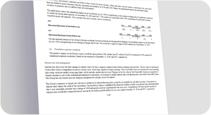 242/264 Notes to the 2017 consolidated financial statements strives, as far as possible, to mitigate its currency exposure in the USD denominated Convertible Notes by matching the balance with USD denominated cash and cash equivalents and short term investments creating a natural hedge. Translation exposure relates to net investments in foreign operations. The Group does not conduct translation risk hedging. (i) Transaction exposure sensitivity In most cases, the Group’s customers are billed in their respective local currency. Major payments, such as salaries, consultancy fees, and rental fees are settled in local currencies. Royalty payments are primarily in EUR and USD. Hence, the operational need to net purchase foreign currency is primarily due to a deficit from such settlements. The table below shows the immediate impact on net loss before tax of a 10% strengthening in the closing exchange rate of significant currencies to which the Group had exposure, at December 31, 2016 and 2017. The sensitivity associated with a 10% weakening of a particular currency would be equal and opposite. This assumes that each currency moves in isolation. 2016 SEK AUD EUR GBP USD (in € millions) (Increase)/decrease in loss before tax (20 ) 6 (36 ) (22 ) (31 ) 2017 SEK AUD EUR GBP USD (in € millions) (Increase)/decrease in loss before tax 1 5 2 (2 ) 9 For the notional amount of the Group’s foreign exchange forward contracts not designated for hedging, the immediate impact on net loss before tax of a 10% strengthening in the closing exchange rate of the USD would be a negative impact of €26 million as of December 31, 2017. (ii) Translation exposure sensitivity The positive impact on the Group’s equity would be approximately €40 million and €27 million if the EUR weakened by 10% against all translation exposure currencies, based on the exposure at December 31, 2016 and 2017, respectively. Interest rate risk management Interest rate risk is the risk that changes in interest rates will have a negative impact on the Group’s earnings and cash flow. The fair value of the Group’s Convertible Notes is dependent on market interest rates, which may negatively impact earnings. The Convertible Notes are remeasured at each reporting date using valuation models using input data, which includes market interest rates. Changes in the fair value of the Convertible Notes are recognized in finance income or cost in the consolidated statement of operations. An increase in market interest rates will decrease the value of the Convertible Notes. The Group has not entered into any hedging arrangement to mitigate these fluctuations. The Group’s exposure to interest rate risk also is related to its interestbearing assets, primarily its available for sale debt securities. Fluctuations in interest rates impact the yield of the investment. The sensitivity analysis considered the historical volatility of short term interest rates and determined that it was reasonably possible that a change of 100 basis points could be experienced in the near term. A hypothetical 100 basis points increase in interest rates would have impacted interest income by €6 million and €8 million for the years ended December 31, 2016 and 2017, respectively. F49