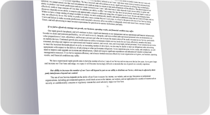 38/264 Google competes with us, we do not believe that Google will use the GCP operation in such a manner as to gain competitive advantage against our Service. If we fail to accurately predict, recommend, and play music that our Users enjoy, we may fail to retain existing Users and attract new Users in sufficient numbers to meet investor expectations for growth or to operate our business profitably. We believe that a key differentiating factor between Spotify and other music content providers is our ability to predict music that our Users will enjoy. Our system for predicting User music preferences and selecting music tailored to our Users’ individual music tastes is based on advanced data analytics systems and our proprietary algorithms. We have invested, and will continue to invest, significant resources in refining these technologies; however, we cannot assure you that such investments will yield an attractive return or that such refinements will be effective. The effectiveness of our ability to predict User music preferences and select music tailored to our Users’ individual music tastes depends in part on our ability to gather and effectively analyze large amounts of User data. In addition, our ability to offer Users songs that they have not previously heard and impart a sense of discovery depends on our ability to acquire and appropriately categorize additional songs that will appeal to our Users’ diverse and changing tastes. While we have a large catalog of songs available to stream, we must continuously identify and analyze additional songs that our Users will enjoy and we may not effectively do so. Our ability to predict and select music content that our Users enjoy is critical to the perceived value of our Service among Users and failure to make accurate predictions could materially adversely affect our ability to adequately attract and retain Users, increase Content Hours, and sell advertising to meet investor expectations for growth or to operate the business profitably. If we fail to effectively manage our growth, our business, operating results, and financial condition may suffer. Our rapid growth has placed, and will continue to place, significant demands on our management and our operational and financial infrastructure. In order to attain and maintain profitability, we will need to recruit, integrate, and retain skilled and experienced personnel who can demonstrate our value proposition to Users, advertisers, and business partners and who can increase the monetization of the music streamed on our Service, particularly on mobile devices. Continued growth also could strain our ability to maintain reliable service levels for our Users, effectively monetize the music streamed, develop and improve our operational and financial controls, and recruit, train, and retain highly skilled personnel. If our systems do not evolve to meet the increased demands placed on us by an increasing number of advertisers, we also may be unable to meet our obligations under advertising agreements with respect to the delivery of advertising or other performance obligations. As our operations grow in size, scope, and complexity, we will need to improve and upgrade our systems and infrastructure, which will require significant expenditures and allocation of valuable technical and management resources. If we fail to maintain efficiency and allocate limited resources effectively in our organization as it grows, our business, operating results, and financial condition may suffer. We have experienced rapid growth rates in both the number of active Users of our Service and revenue over the last few years. As we grow larger and increase our User base and usage, we expect it will become increasingly difficult to maintain the rate of growth we currently experience. Our ability to increase the number of our Users will depend in part on our ability to distribute our Service, which may be affected by third­ party interference beyond our control. The use of our Service depends on the ability of our Users to access the internet, our website, and our app. Enterprises or professional organizations, including governmental agencies, could block access to the internet, our website, and our application for a number of reasons such as security or confidentiality concerns or regulatory reasons that could adversely impact our User base. 31