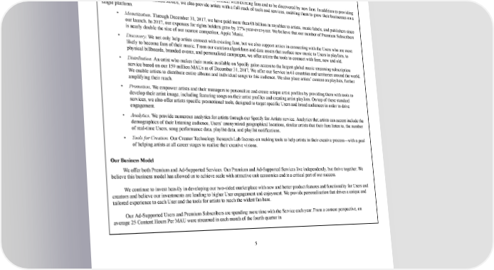 12/264 consoles to cars. The flexibility of our platform and the ability to access it via a single user ID across mobile, tablet, and other connected devices creates a seamless and integrated experience that is designed to fit a variety of lifestyles. As an independent service, we are uniquely positioned to work with the broadest set of partners in the ecosystem. Benefits for Creators Spotify provides a large stage for creators and artists to connect with existing fans and to be discovered by new fans. In addition to providing artists with access to 159 million MAUs, we also provide artists with a full stack of tools and services, enabling them to grow their businesses on a single platform. • Monetization. Through December 31, 2017, we have paid more than €8 billion in royalties to artists, music labels, and publishers since our launch. In 2017, our expenses for rights holders grew by 27% yearoveryear. We believe that our number of Premium Subscribers is nearly double the size of our nearest competitor, Apple Music. • Discovery. We not only help artists connect with existing fans, but we also support artists in connecting with the Users who are most likely to become fans of their music. From our curation algorithms and data assets that surface new music to Users in playlists, to physical billboards, branded events, and personalized campaigns, we offer artists the tools to connect with fans, new and old. • Distribution. An artist who makes their music available on Spotify gains access to the largest global music streaming subscription service based on our 159 million MAUs as of December 31, 2017. We offer our Service in 61 countries and territories around the world. We enable artists to distribute entire albums and individual songs to this audience. We also place artists’ content on playlists, further amplifying their reach. • Promotion . We empower artists and their managers to personalize and create unique artist profiles by providing them with tools to develop their artist image, including featuring songs on their artist profiles and creating artist playlists. On top of these standard services, we also offer artists specific promotional tools, designed to target specific Users and broad audiences in order to drive engagement. • Analytics . We provide numerous analytics for artists through our Spotify for Artists service. Analytics that artists can access include the demographics of their listening audience, Users’ anonymized geographical locations, similar artists that their fans listen to, the number of realtime Users, song performance data, playlist data, and playlist notifications. • Tools for Creation. Our Creator Technology Research Lab focuses on making tools to help artists in their creative process—with a goal of helping artists at all career stages to realize their creative visions. Our Business Model We offer both Premium and AdSupported Services. Our Premium and AdSupported Services live independently, but thrive together. We believe this business model has allowed us to achieve scale with attractive unit economics and is a critical part of our success. We continue to invest heavily in developing our twosided marketplace with new and better product features and functionality for Users and creators and believe our investments are leading to higher User engagement and enjoyment. We provide personalization that drives a unique and tailored experience to each User and the tools for artists to reach the widest fan base. Our AdSupported Users and Premium Subscribers are spending more time with the Service each year. From a content perspective, on average 25 Content Hours Per MAU were streamed in each month of the fourth quarter in 5