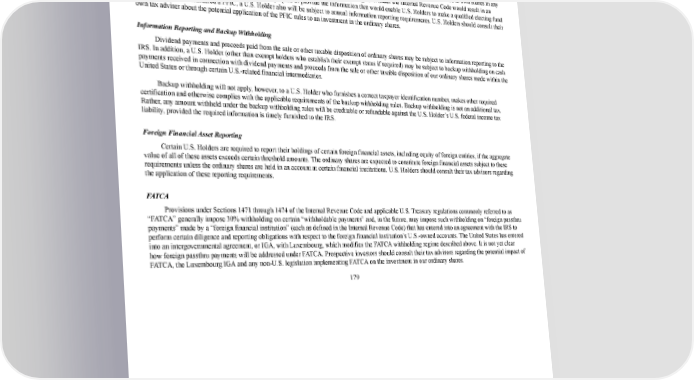 186/264 amount allocated to each other taxable year would be subject to tax at the highest rate in effect for individuals or corporations, as appropriate, for that taxable year, and an interest charge would be imposed. Further, to the extent that any distribution received by a U.S. Holder on our ordinary shares exceeds 125% of the average of the annual distributions on the ordinary shares received during the preceding three years or the U.S. Holder’s holding period, whichever is shorter, that distribution would be subject to taxation in the same manner as gain on the sale or other disposition of ordinary shares if we were a PFIC, described above. Certain elections may be available that would result in alternative treatments (such as marktomarket treatment) of the ordinary shares. If we are treated as a PFIC with respect to a U.S. Holder for any taxable year, the U.S. Holder will be deemed to own shares in any of our subsidiaries that also are PFICs. A timely election to treat us as a qualified electing fund under the Internal Revenue Code would result in an alternative treatment. However, we do not intend to prepare or provide the information that would enable U.S. Holders to make a qualified electing fund election. If we are considered a PFIC, a U.S. Holder also will be subject to annual information reporting requirements. U.S. Holders should consult their own tax adviser about the potential application of the PFIC rules to an investment in the ordinary shares. Information Reporting and Backup Withholding Dividend payments and proceeds paid from the sale or other taxable disposition of ordinary shares may be subject to information reporting to the IRS. In addition, a U.S. Holder (other than exempt holders who establish their exempt status if required) may be subject to backup withholding on cash payments received in connection with dividend payments and proceeds from the sale or other taxable disposition of our ordinary shares made within the United States or through certain U.S.related financial intermediaries. Backup withholding will not apply, however, to a U.S. Holder who furnishes a correct taxpayer identification number, makes other required certification and otherwise complies with the applicable requirements of the backup withholding rules. Backup withholding is not an additional tax. Rather, any amount withheld under the backup withholding rules will be creditable or refundable against the U.S. Holder’s U.S. federal income tax liability, provided the required information is timely furnished to the IRS. Foreign Financial Asset Reporting Certain U.S. Holders are required to report their holdings of certain foreign financial assets, including equity of foreign entities, if the aggregate value of all of these assets exceeds certain threshold amounts. The ordinary shares are expected to constitute foreign financial assets subject to these requirements unless the ordinary shares are held in an account at certain financial institutions. U.S. Holders should consult their tax advisors regarding the application of these reporting requirements. FATCA Provisions under Sections 1471 through 1474 of the Internal Revenue Code and applicable U.S. Treasury regulations commonly referred to as “FATCA” generally impose 30% withholding on certain “withholdable payments” and, in the future, may impose such withholding on “foreign passthru payments” made by a “foreign financial institution” (each as defined in the Internal Revenue Code) that has entered into an agreement with the IRS to perform certain diligence and reporting obligations with respect to the foreign financial institution’s U.S.owned accounts. The United States has entered into an intergovernmental agreement, or IGA, with Luxembourg, which modifies the FATCA withholding regime described above. It is not yet clear how foreign passthru payments will be addressed under FATCA. Prospective investors should consult their tax advisors regarding the potential impact of FATCA, the Luxembourg IGA and any nonU.S. legislation implementing FATCA on the investment in our ordinary shares. 179