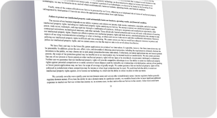29/264 potentially unfavorable royalty or license agreements in order to obtain the right to use necessary technologies, content, or materials; indemnify our partners and other third parties; and/or take other actions that may have material effects on our business, operating results, and financial condition. Moreover, we rely on multiple software programmers to design our proprietary technologies, and we regularly contribute software source code under “open source” licenses and have made technology we developed available under open source licenses. Although we make every effort to prevent the incorporation of licenses that would require us to disclose code and/or innovations in our products, we do not exercise complete control over the development efforts of our programmers, and we cannot be certain that our programmers have not used software that is subject to such licenses or that they will not do so in the future. In the event that portions of our proprietary technology are determined to be subject to licenses that require us to publicly release the affected portions of our source code, reengineer a portion of our technologies, or otherwise be limited in the licensing of our technologies, we may be forced to do so, each of which could materially harm our business, operating results, and financial condition. Finally, some of the content offered on our Service is generated by our Users, subjecting us to heightened risk of claims of intellectual property infringement by thirdparties if Users do not obtain the appropriate authorizations from rights holders. Failure to protect our intellectual property could substantially harm our business, operating results, and financial condition. The success of our business depends on our ability to protect and enforce our patents, trade secrets, trademarks, copyrights, and all of our other intellectual property rights, including our intellectual property rights underlying our Service. We attempt to protect our intellectual property under patent, trade secret, trademark, and copyright law through a combination of employee, thirdparty assignment and nondisclosure agreements, other contractual restrictions, technological measures, and other methods. These afford only limited protection and we are still early in the process of securing our intellectual property rights. Despite our efforts to protect our intellectual property rights and trade secrets, unauthorized parties may attempt to copy aspects of our song recommendation technology or other technology, or obtain and use our trade secrets and other confidential information. Moreover, policing our intellectual property rights is difficult and time consuming. We cannot assure you that we would have adequate resources to protect and police our intellectual property rights, and we cannot assure you that the steps we take to do so will always be effective. We have filed, and may in the future file, patent applications on certain of our innovations. It is possible, however, that these innovations may not be patentable. In addition, given the cost, effort, risks, and downside of obtaining patent protection, including the requirement to ultimately disclose the invention to the public, we may choose not to seek patent protection for some innovations. Furthermore, our patent applications may not issue as granted patents, the scope of the protection gained may be insufficient or an issued patent may be deemed invalid or unenforceable. We also cannot guarantee that any of our present or future patents or other intellectual property rights will not lapse or be invalidated, circumvented, challenged, or abandoned. Neither can we guarantee that our intellectual property rights will provide competitive advantages to us. Our ability to assert our intellectual property rights against potential competitors or to settle current or future disputes could be limited by our relationships with third parties, and any of our pending or future patent applications may not have the scope of coverage originally sought. We cannot guarantee that our intellectual property rights will be enforced in jurisdictions where competition may be intense or where legal protection may be weak. We could lose both the ability to assert our intellectual property rights against, or to license our technology to, others and the ability to collect royalties or other payments. We currently own the www.spotify.com internet domain name and various other related domain names. Internet regulatory bodies generally regulate domain names. If we lose the ability to use a domain name in a particular country, we would be forced either to incur significant additional expenses to market our Service within that country or, in extreme cases, to elect not to offer our Service in that country. Either result could harm 22