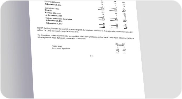 226/264 Notes to the 2017 consolidated financial statements Property and equipment Leasehold improvements Total (in € millions) Accumulated depreciation At January 1, 2016 (47 ) (9 ) (56 ) Depreciation charge (26 ) (6 ) (32 ) Disposals 10 1 11 Exchange differences 1 (1 ) — At December 31, 2016 (62 ) (15 ) (77 ) Depreciation charge (37 ) (9 ) (46 ) Disposals 11 2 13 Exchange differences 4 1 5 At December 31, 2017 (84 ) (21 ) (105 ) Cost, net accumulated depreciation At December 31, 2016 49 36 85 At December 31, 2017 21 52 73 In 2017, the Group shortened the useful life of certain equipment due to a planned transition to the cloud and recorded accelerated depreciation of €11 million. The Group had no such charges in 2016 and 2015. The Group leases various equipment under noncancellable finance lease agreements over a lease term of 3 years. Property and equipment includes the following amounts where the Group is a lessee under a finance lease: 2016 2017 (in € millions) Finance leases 15 15 Accumulated depreciation (10 ) (14 ) 5 1 F33