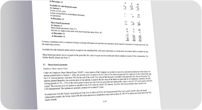 232/264 Notes to the 2017 consolidated financial statements Other reserves 2015 2016 2017 (in € millions) Currency translation At January 1 8 8 (4 ) Currency translation — (12 ) (3 ) At December 31 8 (4 ) (7 ) Available for sale financial assets At January 1 — — (4 ) Losses on fair value — (4 ) (13 ) Losses reclassified to consolidated statement of operations — — 1 At December 31 — (4 ) (16 ) Sharebased payments At January 1 47 77 130 Sharebased payments (Note 17) 29 53 67 Income tax impact associated with sharebased payments (Note 10) 1 — 3 At December 31 77 130 200 At December 31 85 122 177 Currency translation reserve comprises foreign exchange differences arising from the translation of the financial statements of foreign operations into the reporting currency. Available for sale financial assets reserve recognizes the unrealized fair value gains and losses on current asset investments held as available for sale. Sharebased payments reserve recognizes the grant date fair value of equitysettled awards provided to employees as part of their remuneration. For further details, please see Note 17. 17. Sharebased payments Employee Share Option Plans Under the Employee Share Option Plans (“ESOP”), share options of the Company are granted to executives and certain employees of the Group. For options granted prior to January 1, 2016, the exercise price is equal to the fair value of the shares on grant date for employees in the United States and for U.S. citizens and fair value less 30% for the rest of the world. The value of the discount is included in the grant date fair value of the award. For options granted thereafter, the exercise price of the options is equal to the fair value of the shares on grant date for all employees. Generally, the first vesting period (13.5% – 25% of the initial grant) is up to one year from the grant date and subsequently vests at a rate of 6.25% each quarter until fully vested. The exercise price for options is payable in the EUR value of a fixed USD amount; therefore, the Group considers these awards to be USDdenominated. The options are generally granted with a term of 5 years. In connection with the Group’s acquisition of Echo Nest in March of 2014, the Group assumed Echo Nest’s equity incentive plan and issued replacement awards, the Group issued 458,160 stock options at a weightedaverage exercise price of US$7.05 to replace previously held Echo Nest equity awards. F39
