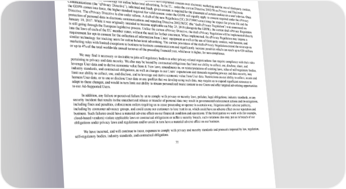 42/264 EU Safe Harbor framework regarding the transfer of personal data from the EU to the United States. EU and U.S. negotiators agreed in February 2016 to a new framework, the Privacy Shield, which would replace the Safe Harbor framework. However, there is currently litigation challenging this framework as well as litigation challenging other EU mechanisms for adequate data transfers (for example, the standard contractual clauses), and it is uncertain whether the Privacy Shield framework and/or the standard contractual clauses similarly will be invalidated by the EU courts in the future. We rely on a mixture of mechanisms to transfer data to and from our EU business to the United States and could be impacted by changes in law as a result of the current challenges to these mechanisms in the European courts. In recent years, U.S. and European lawmakers and regulators have expressed concern over electronic marketing and the use of thirdparty cookies, web beacons, and similar technology for online behavioral advertising. In the EU, under the current Directive 2002/58 on Privacy and Electronic Communications (the “ePrivacy Directive”), informed and freely given consent is required for the placement of certain cookies on a user’s device. Once the GDPR comes into force, the higher standard required for valid consent under the GDPR will equally apply to consent required under the ePrivacy Directive. The ePrivacy Directive is also under reform. A draft of the new Regulation (EC) 2017/0003 concerning the respect for private life and the protection of personal data in electronic communications and repealing Directive 2002/58/EC (the “draft ePrivacy Regulation”) was announced on January 10, 2017. While it was originally intended to become applicable on May 25, 2018 (alongside the GDPR), the current draft ePrivacy Regulation is still going through the European legislative process. Unlike the current ePrivacy Directive, the draft ePrivacy Regulation will be implemented directly into the laws of each of the EU member states, without the need for further enactment. When implemented, the ePrivacy Regulation may impose a requirement for optin consent for the collection of information from Users’ equipment as well as the use of thirdparty cookies, web beacons, and similar technology for tracking users for online behavioral advertising. The current provisions of the draft ePrivacy Regulation extend the strict optin marketing rules with limited exceptions to business to business communications and significantly increase penalties which can reach up to €20 million or up to 4% of the total worldwide annual turnover of the preceding financial year, whichever is higher, for noncompliance. We may find it necessary or desirable to join selfregulatory bodies or other privacyrelated organizations that require compliance with their rules pertaining to privacy and data security. We also may be bound by contractual obligations that limit our ability to collect, use, disclose, share, and leverage User data and to derive economic value from it. New laws, amendments to, or reinterpretations of existing laws, rules of selfregulatory bodies, industry standards, and contractual obligations, as well as changes in our Users’ expectations and demands regarding privacy and data security, may limit our ability to collect, use, and disclose, and to leverage and derive economic value from User data. Restrictions on our ability to collect, access and harness User data, or to use or disclose User data or any profiles that we develop using such data, may require us to expend significant resources to adapt to these changes, and would in turn limit our ability to stream personalized music content to our Users and offer targeted advertising opportunities to our AdSupported Users. In addition, any failure or perceived failure by us to comply with privacy or security laws, policies, legal obligations, industry standards, or any security incident that results in the unauthorized release or transfer of personal data may result in governmental enforcement actions and investigations, including fines and penalties, enforcement orders requiring us to cease processing or operate in a certain way, litigation and/or adverse publicity, including by consumer advocacy groups, and could cause our customers to lose trust in us, which could have an adverse effect on our reputation and business. Such failures could have a material adverse effect on our financial condition and operations. If the third parties we work with (for example, cloudbased vendors) violate applicable laws or contractual obligations or suffer a security breach, such violations also may put us in breach of our obligations under privacy laws and regulations and/or could in turn have a material adverse effect on our business. We have incurred, and will continue to incur, expenses to comply with privacy and security standards and protocols imposed by law, regulation, selfregulatory bodies, industry standards, and contractual obligations. 35
