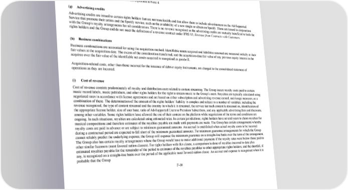 203/264 Notes to the 2017 consolidated financial statements Goodwill and fair value adjustments arising on the acquisition of a foreign operation are treated as assets and liabilities of the operation and translated at the closing rate at each reporting date. (f) Revenue recognition Accounting policies for the Group’s revenues are explained in Note 4. (g) Advertising credits Advertising credits are issued to certain rights holders that are not transferable and that allow them to include advertisement on the AdSupported Service that promote their artists and the Spotify service, such as the availability of a new single or album on Spotify. These are issued in conjunction with the Group’s royalty arrangements for nil consideration. There is no revenue recognized as the advertising credits are mutually beneficial to both the rights holders and the Group and do not meet the definition of a revenue contract under IFRS 15, Revenue from Contracts with Customers. (h) Business combinations Business combinations are accounted for using the acquisition method. Identifiable assets acquired and liabilities assumed are measured initially at their fair values at the acquisition date. The excess of the consideration transferred, and the acquisitiondate fair value of any previous equity interest in the acquiree over the fair value of the identifiable net assets acquired is recognized as goodwill. Acquisitionrelated costs, other than those incurred for the issuance of debt or equity instruments, are charged to the consolidated statement of operations as they are incurred. (i) Cost of revenue Cost of revenue consists predominately of royalty and distribution costs related to content streaming. The Group incurs royalty costs paid to certain music record labels, music publishers, and other rights holders for the right to stream music to the Group’s users. Royalties are typically calculated using negotiated rates in accordance with license agreements and are based on either subscription and advertising revenue earned, user/usage measures, or a combination of these. The determination of the amount of the rights holders’ liability is complex and subject to a number of variables, including the revenue recognized, the type of content streamed and the country in which it is streamed, the service tier such content is streamed on, identification of the appropriate license holder, size of user base, ratio of AdSupported Users to Premium Subscribers, and any applicable advertising fees and discounts, among other variables. Some rights holders have allowed the use of their content on the platform while negotiations of the terms and conditions are ongoing. In such situations, royalties are calculated using estimated rates. In certain jurisdictions, rights holders have several years to claim royalties for musical compositions and therefore estimates of the royalties payable are made until payments are made. The Group has certain arrangements whereby royalty costs are paid in advance or are subject to minimum guaranteed amounts. An accrual is established when actual royalty costs to be incurred during a contractual period are expected to fall short of the minimum guaranteed amounts. For minimum guarantee arrangements for which the Group cannot reliably predict the underlying expense, the Group will expense the minimum guarantee on a straightline basis over the term of the arrangement. The Group also has certain royalty arrangements where the Group would have to make additional payments if the royalty rates were below those paid to other similar licensors (most favored nation clauses). For rights holders with this clause, a comparison is done of royalties incurred to date plus estimated royalties payable for the remainder of the period to estimates of the royalties payables to other appropriate rights holders, and the shortfall, if any, is recognized on a straightline basis over the period of the applicable most favored nation clause. An accrual and expense is recognized when it is probable that the Group F10