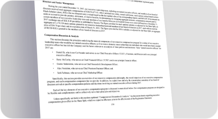 137/264 • discussing the annual audited financial statements and quarterly financial statements with management and our independent registered public accounting firm; • annually reviewing and reassessing the adequacy of our audit committee charter; • such other matters that are specifically delegated to our audit committee by our board of directors from time to time; and • meeting periodically with management and, separately from management, with our internal auditors and independent registered public accounting firm. Directors and Senior Management During the year ended December 31, 2017, our executive leadership team, including our named executive officers, and members of our board of directors received total aggregate compensation of $28,034,473.65, which included base salary, annual cash bonus, stock options (valued based on their BlackScholes value), RSUs (for our directors only) (valued based on the fair market value of the corresponding shares), and $434,247.18 in amounts set aside or accrued to provide pension, retirement, or similar benefits. In determining the foregoing aggregate amounts, compensation amounts paid to certain members of our executive leadership team and members of our board of directors in Swedish Krona were converted based on a December 31, 2017 exchange rate of SEK 8.20 per dollar as published by Reuters. The figure provided for stock options includes, as adjusted for the Share Split, an aggregate of 1,170,320 stock options granted to our executive leadership team and members of our board of directors in 2017, each with an exercise price of $50.70 per share and an expiration date of March 31, 2022. The figure provided for RSUs includes, as adjusted for the Share Split, an aggregate of 80,920 RSUs granted to the members of our board of directors in 2017. Compensation Discussion & Analysis This section discusses the principles underlying the material components of our executive compensation program for a subset of our executive leadership team who would be our named executive officers, as if we were a domestic issuer (other than one individual who would have been a named executive officer but has left the Company) and the factors relevant to an analysis of these policies and decisions. These “named executive officers” for 2017 are: • Daniel Ek, who is our CoFounder and serves as our Chief Executive Officer (“CEO”), Chairman, and Director and is our principal executive officer; • Barry McCarthy, who serves as Chief Financial Officer (“CFO”) and is our principal financial officer; • Gustav Söderström, who serves as Chief Research & Development Officer; • Alex Norström, who serves as Chief Premium Business Officer; and • Seth Farbman, who serves as Chief Marketing Officer. Specifically, this section provides an overview of our executive compensation philosophy, the overall objectives of our executive compensation program, and each compensation component that we provide. In addition, we explain how and why the remuneration committee of our board of directors arrived at specific compensation policies and decisions involving our named executive officers during 2017. Each of the key elements of our executive compensation program is discussed in more detail below. Our compensation programs are designed to be flexible and complementary and to collectively serve their principles and objectives. Unless specifically set forth in this section captioned “Compensation Discussion & Analysis,” the discussion herein regarding executive compensation gives effect to the Share Split, which we expect to effectuate prior to the effectiveness of the Registration Statement. 130