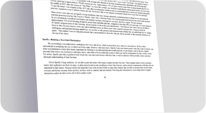 105/264 One prominent example of how Spotify enabled an aspiring artist to reach a global audience is international pop star Lorde. Lorde started out as a singersongwriter from New Zealand looking to break out with her new single, “Royals,” when Sean Parker added her single to his popular playlist Hipster International. After approximately one month, Lorde had jumped past prominent artists such as Katy Perry, Drake, and Lady Gaga to land at the top of Spotify’s Viral Chart, and after eight months, she had reached over 100 million streams on Spotify and was #1 on the Billboard Hot 100. Another example is Lauv, who we identified as a talented new artist and helped succeed by helping Spotify Users discover his music. Prior to 2016, Lauv was an indie artist with a limited number of mainstream fans. In early 2017, Lauv’s track “The Other” was added to Today’s Top Hits. The song quickly grew in popularity, with average daily streams of the song increasing nearly threefold in the following three months, growing to approximately 750,000 streams per day. Approximately 70% of those streams came from our programmed playlists. In the middle of 2017, after the success of “The Other,” we were able to help Lauv build his brand identity and personal profile. His next song “I Like Me Better” was released in May 2017 and, after its subsequent inclusion into our curated playlists as well as our machinegenerated playlists, it peaked at over 4 million streams per day. We believe that we are uniquely positioned to help artists reach their full potential. Many of our Users also rely on Spotify to help soundtrack their day, through editoriallycurated playlists like RapCaviar or personalized machinegenerated playlists like Discover Weekly, Daily Mix, or Release Radar. Our machinegenerated playlists have been made possible by our investments in artificial intelligence and machine learning, which power our music discovery engine. We now program approximately 31% of all listening on Spotify across these and other playlists, compared to less than 20% two years ago. As Users choose to let Spotify program more of their listening, all participants in the music ecosystem benefit. Users discover new music and are still able to listen to their favorite classics, while new and established artists are able to grow their exposure and gain fans. Using our artificial intelligence and machine learning capabilities, we are able to find, promote and program songs whether they are established hits or “hidden gems.” This enables Users to find great content that is personalized for them, but that may not be currently in their personal libraries or at the top of the charts. Spotify—Building a TwoSided Marketplace We are building a twosided music marketplace for Users and artists, which is powered by data, analytics, and software. We have been instrumental in reshaping the way in which our Users enjoy, discover, and share music. Spotify Users can choose exactly what they want to listen to, can allow our platform to create their music experience by listening to our personalized and curated playlists, or can choose a mix of the two. Spotify provides fans with a way to discover and enjoy music, and artists with an additional avenue to showcase and be compensated for their creative works. For artists, Spotify provides a platform from which they can reach and interact with their fans, as well as analytics which provide a better and more thorough understanding of their fan base. Given Spotify’s large audience, we are able to provide artists with unique insights into their fan base. These insights enable artists to promote music their audiences are likely to enjoy, to plan concerts and events according to where their fans are, and to actively communicate with fans who are interested in their music. Because artists can target the Users who are most likely to enjoy their content, they are able to increase their royaltybased revenue and bolster revenue from ancillary services, such as concerts and merchandise. Providing this information to artists helps them to support themselves and to be able to live off of their creative work. 98