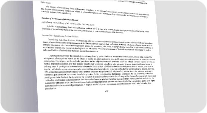 180/264 Under the participation exemption regime, a qualified shareholding held by the Company in a Qualified Subsidiary is exempt for net wealth tax purposes. As from January 1, 2016, a minimum net wealth tax (“MNWT”) is levied on companies having their statutory seat or central administration in Luxembourg. For entities for which the sum of fixed financial assets, receivables against related companies, transferable securities and cash at bank exceeds 90% of their total balance sheet and €350,000, the MNWT is set at €4,815. For all other companies having their statutory seat or central administration in Luxembourg which do not fall within the scope of the €4,815 MNWT, the MNWT ranges from €535 to €32,100, depending on the Company’s total balance sheet. Other Taxes The issuance of our ordinary shares and any other amendment of our articles of association are currently subject to a €75 fixed registration duty. The disposal of our ordinary shares is not subject to a Luxembourg registration tax or stamp duty, unless recorded in a Luxembourg notarial deed or otherwise registered in Luxembourg. Taxation of the Holders of Ordinary Shares Luxembourg Tax Residency of the Holders of Our Ordinary Shares A holder of our ordinary shares will not become resident, nor be deemed to be resident, in Luxembourg by reason only of the holding and/or disposing of our ordinary shares or the execution, performance, or enforcement of his/her rights thereunder. Income Tax—Luxembourg Resident Holders Luxembourg Individual Residents . Dividends and other payments derived from our ordinary shares by resident individual holders of our ordinary shares, who act in the course of the management of either their private wealth or their professional or business activity, are subject to income tax at the ordinary progressive rates. A tax credit is generally granted for withholding taxes levied at source within the limit of the tax payable in Luxembourg on such income, whereby any excess withholding tax is not refundable. 50% of the gross amount of dividends received from the Company by resident individual holders of our ordinary shares are exempt from income tax. Capital gains realized on the disposal of our ordinary shares by resident individual holders of our ordinary shares, who act in the course of the management of their private wealth, are not subject to income tax, unless said capital gains qualify either as speculative gains or as gains on a substantial participation. Capital gains are deemed to be speculative and are subject to income tax at ordinary rates if our ordinary shares are disposed of within six months after their acquisition or if their disposal precedes their acquisition. Speculative gains are subject to income tax as miscellaneous income at ordinary rates. A participation is deemed to be substantial where a resident individual holder of our ordinary shares holds or has held, either alone or together with his/her spouse or partner and/or minor children, directly or indirectly at any time within the five years preceding the disposal, more than 10% of the share capital of the Company whose ordinary shares are being disposed of. A holder of our ordinary shares also is deemed to alienate a substantial participation if he acquired free of charge, within the five years preceding the transfer, a participation that was constituting a substantial participation in the hands of the alienator (or the alienators in case of successive transfers free of charge within the same fiveyear period). Capital gains realized on a substantial participation more than six months after the acquisition thereof are taxed according to the halfglobal rate method, (i.e., the average rate applicable to the total income is calculated according to progressive income tax rates and half of the average rate is applied to the capital gains realized on the substantial participation). A disposal may include a sale, an exchange, a contribution or any other kind of alienation of the participation. 173
