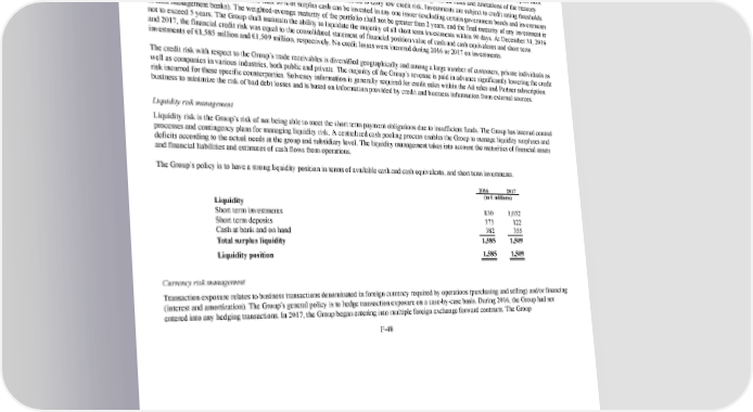 241/264 Notes to the 2017 consolidated financial statements Credit risk management Financial assets carry an element of risk that counterparties may be unable to fulfill their obligations. This exposure arises from the investments in liquid funds of banks and other counterparties. The Group mitigates this risk by adopting a risk adverse approach in relation to the investment of surplus cash. The main objectives for investments are first, to preserve principal and secondarily, to maximize return given the rules and limitations of the treasury policy. Surplus cash is invested in counterparties and instruments considered to carry low credit risk. Investments are subject to credit rating thresholds and at the time of investment, no more than 10% of surplus cash can be invested in any one issuer (excluding certain government bonds and investments in cash management banks). The weightedaverage maturity of the portfolio shall not be greater than 2 years, and the final maturity of any investment is not to exceed 5 years. The Group shall maintain the ability to liquidate the majority of all short term investments within 90 days. At December 31, 2016 and 2017, the financial credit risk was equal to the consolidated statement of financial position value of cash and cash equivalents and short term investments of €1,585 million and €1,509 million, respectively. No credit losses were incurred during 2016 or 2017 on investments. The credit risk with respect to the Group’s trade receivables is diversified geographically and among a large number of customers, private individuals as well as companies in various industries, both public and private. The majority of the Group’s revenue is paid in advance significantly lowering the credit risk incurred for these specific counterparties. Solvency information is generally required for credit sales within the Ad sales and Partner subscription business to minimize the risk of bad debt losses and is based on information provided by credit and business information from external sources. Liquidity risk management Liquidity risk is the Group’s risk of not being able to meet the short term payment obligations due to insufficient funds. The Group has internal control processes and contingency plans for managing liquidity risk. A centralized cash pooling process enables the Group to manage liquidity surpluses and deficits according to the actual needs at the group and subsidiary level. The liquidity management takes into account the maturities of financial assets and financial liabilities and estimates of cash flows from operations. The Group’s policy is to have a strong liquidity position in terms of available cash and cash equivalents, and short term investments. 2016 2017 (in € millions) Liquidity Short term investments 830 1,032 Short term deposits 373 122 Cash at bank and on hand 382 355 Total surplus liquidity 1,585 1,509 Liquidity position 1,585 1,509 Currency risk management Transaction exposure relates to business transactions denominated in foreign currency required by operations (purchasing and selling) and/or financing (interest and amortization). The Group’s general policy is to hedge transaction exposure on a casebycase basis. During 2016, the Group had not entered into any hedging transactions. In 2017, the Group began entering into multiple foreign exchange forward contracts. The Group F48