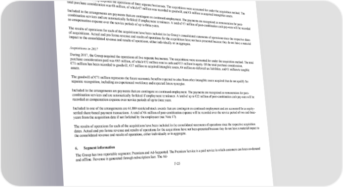 218/264 Notes to the 2017 consolidated financial statements Included in the arrangements are payments that are contingent on continued employment. The payments are remuneration for postcombination services and are automatically forfeited if employment terminates. A total of €2 million of postcombination cash payouts will be recorded as compensation expense over the service period of three years. Acquisitions in 2016 During 2016, the Group acquired the operations of three separate businesses. The acquisitions were accounted for under the acquisition method. The total purchase consideration was €8 million, of which €7 million was recorded to goodwill, and €1 million to acquired intangibles assets. Included in the arrangements are payments that are contingent on continued employment. The payments are recognized as remuneration for post combination services and are automatically forfeited if employment terminates. A total of €3 million of postcombination cash payouts will be recorded as compensation expense over the service periods of up to three years. The results of operations for each of the acquisitions have been included in the Group’s consolidated statements of operations since the respective dates of acquisitions. Actual and pro forma revenue and results of operations for the acquisitions have not been presented because they do not have a material impact to the consolidated revenue and results of operations, either individually or in aggregate. Acquisitions in 2017 During 2017, the Group acquired the operations of five separate businesses. The acquisitions were accounted for under the acquisition method. The total purchase consideration paid was €85 million, of which €52 million was in cash and €33 million in equity. Of the total purchase consideration, €71 million has been recorded to goodwill, €17 million to acquired intangible assets, €4 million to deferred tax liabilities, and €1 million to tangible assets. The goodwill of €71 million represents the future economic benefits expected to arise from other intangible assets acquired that do not qualify for separate recognition, including an experienced workforce and expected future synergies. Included in the arrangements are payments that are contingent on continued employment. The payments are recognized as remuneration for post combination services and are automatically forfeited if employment terminates. A total of up to €22 million of postcombination cash payouts will be recorded as compensation expense over service periods of up to three years. Included in one of the arrangements are 61,880 restricted stock awards that are contingent on continued employment and are accounted for as equity settled sharebased payment transactions. A total of €6 million of postcombination expense will be recorded over the service period of two and three years from the acquisition date if not forfeited by the employees (see Note 17). The results of operations for each of the acquisitions have been included in the consolidated statements of operations since the respective acquisition dates. Actual and pro forma revenue and results of operations for the acquisitions have not been presented because they do not have a material impact to the consolidated revenue and results of operations, either individually or in aggregate. 6. Segment information The Group has two reportable segments: Premium and AdSupported. The Premium Service is a paid service in which customers can listen ondemand and offline. Revenue is generated through subscription fees. The Ad F25