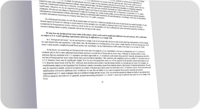 59/264 Risks Related to Investment in a Luxembourg Company and Our Status as a Foreign Private Issuer As a foreign private issuer, we are exempt from a number of U.S. securities laws and rules promulgated thereunder and are permitted to publicly disclose less information than U.S. companies must. This may limit the information available to holders of the ordinary shares. We currently qualify as a “foreign private issuer,” as defined in the SEC’s rules and regulations, and, consequently, we are not subject to all of the disclosure requirements applicable to companies organized within the United States. For example, we are exempt from certain rules under the Exchange Act, that regulate disclosure obligations and procedural requirements related to the solicitation of proxies, consents or authorizations applicable to a security registered under the Exchange Act. In addition, our officers and directors are exempt from the reporting and “shortswing” profit recovery provisions of Section 16 of the Exchange Act and related rules with respect to their purchases and sales of our securities. For example, some of our key executives may sell a significant amount of ordinary shares and such sales will not be required to be disclosed as promptly as companies organized within the United States would have to disclose. Accordingly, once such sales are eventually disclosed, our ordinary share price may decline significantly. Moreover, we are not required to file periodic reports and financial statements with the SEC as frequently or as promptly as U.S. public companies. We also are not subject to Regulation FD under the Exchange Act, which would prohibit us from selectively disclosing material nonpublic information to certain persons without concurrently making a widespread public disclosure of such information. Accordingly, there may be less publicly available information concerning our company than there is for U.S. public companies. As a foreign private issuer, we will file an annual report on Form 20F within four months of the close of each fiscal year ended December 31 and furnish reports on Form 6K relating to certain material events promptly after we publicly announce these events. However, because of the above exemptions for foreign private issuers, which we intend to rely on, our shareholders will not be afforded the same information generally available to investors holding shares in public companies that are not foreign private issuers. We may lose our foreign private issuer status in the future, which could result in significant additional costs and expenses. This would make us subject to U.S. GAAP reporting requirements which may be difficult for us to comply with. As a “foreign private issuer,” we are not required to comply with all of the periodic disclosure and current reporting requirements of the Exchange Act and related rules and regulations. Under those rules, the determination of foreign private issuer status is made annually on the last business day of an issuer’s most recently completed second fiscal quarter, and, accordingly, the next determination will be made with respect to us on June 30, 2018. In the future, we would lose our foreign private issuer status if a majority of our shareholders, directors or management are U.S. citizens or residents and we fail to meet additional requirements necessary to avoid loss of foreign private issuer status. Although we intend to follow certain practices that are consistent with U.S. regulatory provisions applicable to U.S. companies, such as providing quarterly financial information to the SEC, our loss of foreign private issuer status would make such provisions mandatory. The regulatory and compliance costs to us under U.S. securities laws as a U.S. domestic issuer may be significantly higher. If we are not a foreign private issuer, we will be required to file periodic reports and prospectus on U.S. domestic issuer forms with the SEC, which are more detailed and extensive than the forms available to a foreign private issuer. For example, we would become subject to the Regulation Fair Disclosure, aimed at preventing issuers from making selective disclosures of material information. We also may be required to modify certain of our policies to comply with good governance practices associated with U.S. domestic issuers. Such conversion and modifications will involve additional costs. In addition, we may lose our ability to rely upon exemptions from certain corporate governance requirements on U.S. stock exchanges that are available to foreign private issuers. Also, we would be required to change our basis of accounting from IFRS as issued by the IASB to U.S. generally accepted accounting principles (“U.S. GAAP”), which may be difficult and costly for us to comply with. If we 52