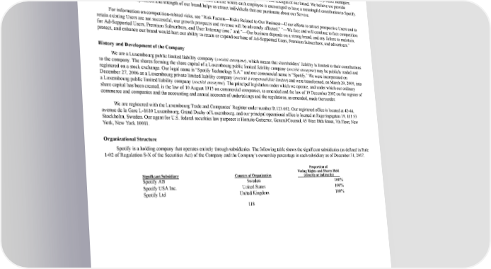 125/264 Additionally, we compete to attract and retain advertisers and a share of their advertising spend for our AdSupported Service. We believe our ability to compete depends primarily on the reputation and strength of our brand as well as our reach and ability to deliver a strong return on investment to our advertisers, which is driven by the size of our AdSupported User database, our advertising products, our targeting, delivery and measurement capabilities, and other tools. We also compete to attract and retain highly talented individuals, including data scientists, engineers, product designers, and product managers. Our ability to attract and retain personnel is driven by compensation, culture, and the reputation and strength of our brand. We believe we provide competitive compensation packages and foster a teamoriented culture where each employee is encouraged to have a meaningful contribution to Spotify. We also believe the reputation and strength of our brand helps us attract individuals that are passionate about our Service. For information on competitionrelated risks, see “Risk Factors—Risks Related to Our Business—If our efforts to attract prospective Users and to retain existing Users are not successful, our growth prospects and revenue will be adversely affected,” “—We face and will continue to face competition for AdSupported Users, Premium Subscribers, and User listening time,” and “—Our business depends on a strong brand, and any failure to maintain, protect, and enhance our brand would hurt our ability to retain or expand our base of AdSupported Users, Premium Subscribers, and advertisers.” History and Development of the Company We are a Luxembourg public limited liability company ( société anonyme ), which means that shareholders’ liability is limited to their contributions to the company. The shares forming the share capital of a Luxembourg public limited liability company ( société anonyme ) may be publicly traded and registered on a stock exchange. Our legal name is “Spotify Technology S.A.” and our commercial name is “Spotify.” We were incorporated on December 27, 2006 as a Luxembourg private limited liability company ( société à responsabilité limitée ) and were transformed, on March 20, 2009, into a Luxembourg public limited liability company ( société anonyme ). The principal legislation under which we operate, and under which our ordinary share capital has been created, is the law of 10 August 1915 on commercial companies, as amended and the law of 19 December 2002 on the register of commerce and companies and the accounting and annual accounts of undertakings and the regulations, as amended, made thereunder. We are registered with the Luxembourg Trade and Companies’ Register under number B.123.052. Our registered office is located at 4244, avenue de la Gare L1610 Luxembourg, Grand Duchy of Luxembourg, and our principal operational office is located at Regeringsgatan 19, 111 53 Stockholm, Sweden. Our agent for U.S. federal securities law purposes is Horacio Gutierrez, General Counsel, 45 West 18th Street, 7th Floor, New York, New York 10011. Organizational Structure Spotify is a holding company that operates entirely through subsidiaries. The following table shows the significant subsidiaries (as defined in Rule 102 of Regulation SX of the Securities Act) of the Company and the Company’s ownership percentage in each subsidiary as of December 31, 2017. Significant Subsidiary Country of Organization Proportion of Voting Rights and Shares Held (directly or indirectly) Spotify AB Sweden 100 % Spotify USA Inc. United States 100 % Spotify Ltd United Kingdom 100 % 118