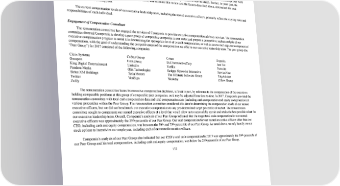 139/264 Following the establishment of the initial compensation arrangements, our CEO, board of directors, and remuneration committee have been responsible for overseeing our executive compensation program, as well as determining and approving the ongoing compensation arrangements for our CEO and other members of the executive leadership team, including the other named executive officers. Typically, in years past, our CEO reviewed the performance of the other members of the executive leadership team, including the other named executive officers, and based on this review, along with the factors described above, made recommendations to the remuneration committee with respect to the total compensation, including each individual component of compensation, of these individuals for the coming year. There was no predetermined time of year for these reviews, although they were generally performed on an annual basis coinciding with our Companywide employee compensation review in March. Further, in years past, the remuneration committee reviewed the performance of our CEO, and based on this review and the factors described above, determined his total compensation for the coming year. The current compensation levels of our executive leadership team, including the named executive officers, primarily reflect the varying roles and responsibilities of each individual. Engagement of Compensation Consultant The remuneration committee has engaged the services of Compensia to provide executive compensation advisory services. The remuneration committee directed Compensia to develop a peer group of comparable companies in our sector and prepare a competitive market analysis of our executive compensation program to assist it in determining the appropriate level of overall compensation, as well as assess each separate component of compensation, with the goal of understanding the competitiveness of the compensation we offer to our executive leadership team. The peer group (the “Peer Group”) for 2017 consisted of the following companies: Citrix Systems CoStar Group Criteo Expedia Groupon HomeAway IAC/InterActiveCorp Just Eat King Digital Entertainment Linkedin Netflix Netsuite Pandora Media Qlik Technologies Scripps Networks Interactive ServiceNow Sirius XM Holdings Tesla Motors The Ultimate Software Group TripAdvisor Twitter VeriSign Workday Zillow Group Zulily The remuneration committee bases its executive compensation decisions, at least in part, by reference to the compensation of the executives holding comparable positions at this group of comparable peer companies, as it may be adjusted from time to time. In 2017, Compensia provided the remuneration committee with total cash compensation data and total compensation data (including cash compensation and equity compensation) at various percentiles within the Peer Group. The remuneration committee considered this data in determining the compensation levels of our named executive officers, but we did not benchmark our executive compensation to any predetermined target percentile of market. The remuneration committee sought to compensate our named executive officers at a level that would allow us to successfully recruit and retain the best possible talent for our executive leadership team. Overall, Compensia’s analysis of our Peer Group indicated that the target total cash compensation for our named executive officers was approximately the 25 th percentile of our Peer Group. Our total compensation for our named executive officers other than our CEO, including cash and equity compensation, was between the 50 th and 75 th percentile of our Peer Group. As noted above, we rely heavily on our stock options to incentivize our employees, including each of our named executive officers. Compensia’s analysis of our Peer Group also indicated that our CEO’s total cash compensation for 2017 was approximately the 50 th percentile of our Peer Group and his total compensation, including cash and equity compensation, was below the 25 th percentile of our Peer Group. 132