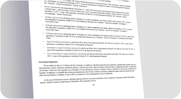129/264 Other Agreements The following is a summary of each material agreement, other than material agreements entered into in the ordinary course of business, to which we are or have been a party, unless entered into with shareholders named in the Registration Statement, for the two years immediately preceding the date of this prospectus: • Voting Agreement by and among Spotify Technology S.A., MH1 LLC (“Tiger”), and D.G.E. Investments Limited (“D.G.E. Investments”), dated February 2, 2017. A copy of this agreement is included a Exhibit 4.1 to the Registration Statement. • Subscription Agreement by and among TME, Tencent Music Entertainment Hong Kong Limited (“TME Hong Kong”), Spotify Technology S.A., and Spotify AB, dated as of December 8, 2017. A copy of this agreement is included as Exhibit 10.20 to the Registration Statement. See “Summary—Recent Developments—Tencent Transactions.” • Investor Agreement by and among Spotify Technology S.A., TME, TME Hong Kong, Tencent, Image Frame Investment (HK) Limited (“Image Frame”), and with respect to certain sections only, D.G.E. Investments and Rosello Company Limited (“Rosello”), dated as of December 15, 2017. A copy of this agreement is included as Exhibit 10.21 to the Registration Statement. See “Summary—Recent Developments—Tencent Transactions.” • Exchange Agreement by and among Spotify Technology S.A. and the noteholders party thereto, dated as of December 8, 2017. A copy of this agreement is included as Exhibit 10.22 to the Registration Statement. See “Summary—Recent Developments—Exchange of Convertible Notes.” • Exchange Agreement by and among Spotify Technology S.A. and the noteholders party thereto, dated as of December 27, 2017. A copy of this agreement is included as Exhibit 10.23 to the Registration Statement. See “Summary—Recent Developments—Exchange of Convertible Notes.” • Exchange Agreement by and among Spotify Technology S.A. and the noteholders party thereto, dated as of January 29, 2018. A copy of this agreement is included as Exhibit 10.24 to the Registration Statement. See “Summary—Recent Developments—Exchange of Convertible Notes.” • Digital Distribution Agreement by and between Sony Music Entertainment and Spotify AB, effective as of April 1, 2017. A copy of this agreement is included as Exhibit 10.25 to the Registration Statement. • Amendment to Digital Distribution Agreement by and between Sony Music Entertainment and Spotify AB, effective as of April 11, 2017. A copy of this agreement is included as Exhibit 10.26 to the Registration Statement. • Second Amendment to Digital Distribution Agreement by and between Sony Music Entertainment and Spotify AB, effective as of April 1, 2017. A copy of this agreement is included as Exhibit 10.27 to the Registration Statement. Government Regulation We are subject to many U.S. federal and state, European, Luxembourg, and other foreign laws and regulations, including those related to privacy, data protection, content regulation, intellectual property, consumer protection, rights of publicity, health and safety, employment and labor, competition, and taxation. These laws and regulations are constantly evolving and may be interpreted, applied, created, or amended in a manner that could harm our business. In addition, it is possible that certain governments may seek to block or limit our products or otherwise impose other restrictions that may affect the accessibility or usability of any or all of our products for an extended period of time or indefinitely. In the area of information security and data protection, the laws in several jurisdictions require companies to implement specific information security controls to protect certain types of information. Data protection, privacy, 122