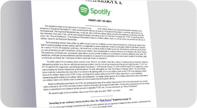 2/264 The information in this prospectus is not complete and may be changed. The securities may not be sold until the Registration Statement filed with the Securities and Exchange Commission is effective. This prospectus is not an offer to sell these securities and it is not soliciting an offer to buy these securities in any state where the offer or sale is not permitted. Subject to Completion, dated , 2018 SPOTIFY TECHNOLOGY S. A. ORDINARY SHARES This prospectus relates to the registration of the resale of up to of our ordinary shares by the registered shareholders identified in this prospectus (“Registered Shareholders”). Unlike an initial public offering, the resale by the Registered Shareholders is not being underwritten by any investment bank. The Registered Shareholders may, or may not, elect to sell their ordinary shares covered by this prospectus, as and to the extent they may determine. Such sales, if any, will be made through brokerage transactions on the New York Stock Exchange (the “NYSE”) at prevailing market prices. See “Plan of Distribution.” If the Registered Shareholders choose to sell their ordinary shares, we will not receive any proceeds from the sale of ordinary shares by the Registered Shareholders. Each outstanding ordinary share entitles the holder thereof to one vote. In addition, we have issued ten beneficiary certificates per ordinary share held of record (excluding warrants, options, and RSUs, as applicable) to entities beneficially owned by our founders, Daniel Ek and Martin Lorentzon, for a total of 379,201,200 beneficiary certificates. Each beneficiary certificate entitles its holder to one vote. Our beneficiary certificates may be issued at a ratio of between one and 20 beneficiary certificates per ordinary share as determined by our board of directors or its delegate at the time of issuance. The beneficiary certificates carry no economic rights and are issued to provide the holders of such beneficiary certificates additional voting rights. The beneficiary certificates are nontransferable and shall automatically be canceled for no consideration in the case of sale or transfer of the ordinary share to which they are linked. See “Description of Share Capital and Articles of Association.” No public market for our ordinary shares currently exists. However, our ordinary shares have a history of trading in private transactions. Based on information available to us, the low and high sales price per ordinary share for such private transactions during the year ended December 31, 2017 was $37.50 and $125.00, respectively, and during the period from January 1, 2018 through February 22, 2018 was $90.00 and $132.50, respectively, in each case excluding the Tencent Transactions (as defined herein). For more information, see “Sale Price History of Ordinary Shares.” Our recent trading prices in private transactions may have little or no relation to the opening public price of our ordinary shares on the NYSE or the subsequent trading price of our ordinary shares on the NYSE. Further, the listing of our ordinary shares on the NYSE without underwriters is a novel method for commencing public trading in our ordinary shares, and consequently, the trading volume and price of our ordinary shares may be more volatile than if our ordinary shares were initially listed in connection with an underwritten initial public offering. Based on information provided by the NYSE, the opening public price of our ordinary shares on the NYSE will be determined by buy and sell orders collected by the NYSE from brokerdealers. Based on such orders, the designated market maker will determine an opening price for our ordinary shares in consultation with a financial advisor pursuant to applicable NYSE rules. For more information, see “Plan of Distribution.” We intend to apply to list our ordinary shares on the NYSE under the symbol “SPOT” on or about , 2018. Investing in our ordinary shar es involves risks. See “ Risk Factors ” beginning on page 14. The Securities and Exchange Commission and state securities regulators have not approved or disapproved these securities, or determined if this prospectus is truthful or complete. Any representation to the contrary is a criminal offense. , 2018