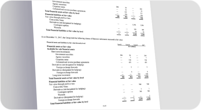 246/264 Notes to the 2017 consolidated financial statements As at December 31, 2016, the Group held the following classes of financial instruments measured at fair value: Financial assets and liabilities by fair value hierarchy level Level 1 Level 2 Level 3 2016 (in € millions) Financial assets at fair value Available for sale financial assets Short term investments: Government securities 248 14 — 262 Agency securities — 55 — 55 Corporate notes — 323 — 323 Collateralized reverse purchase agreements — 190 — 190 Total financial assets at fair value by level 248 582 — 830 Financial liabilities at fair value Fair value through profit or loss: Convertible Notes — — 1,106 1,106 Derivatives (not designated for hedging): Contingent options — — 100 100 Warrants — — 34 34 Total financial liabilities at fair value by level — — 1,240 1,240 As at December 31, 2017, the Group held the following classes of financial instruments measured at fair value: Financial assets and liabilities by fair value hierarchy level Level 1 Level 2 Level 3 2017 (in € millions) Financial assets at fair value Available for sale financial assets Short term investments: Government securities 206 38 — 244 Agency securities — 7 — 7 Corporate notes — 330 — 330 Collateralized reverse purchase agreements — 451 — 451 Derivatives (not designated for hedging): Foreign exchange forwards — 2 — 2 Derivatives (designated for hedging): Foreign exchange forwards — 6 — 6 Long term investment — — 910 910 Total financial assets at fair value by level 206 834 910 1,950 Financial liabilities at fair value Fair value through profit or loss: Convertible Notes — — 944 944 Derivatives (not designated for hedging): Contingent options — — 3 3 Warrants — — 346 346 Derivatives (designated for hedging): Foreign exchange forwards — 5 — 5 Total financial liabilities at fair value by level — 5 1,293 1,298 F53