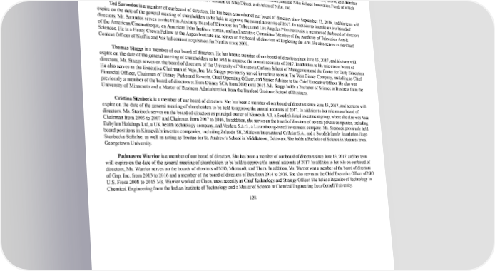 135/264 Executive Officer, from December 2015 to May 2017. Mr. Mehrotra is the CEO and CoFounder of Coda, Inc. Mr. Mehrotra has previously served as a Vice President of Product and Engineering at Google and Director of Program Management at Microsoft. Mr. Mehrotra holds a Bachelor of Science in Computer Science and a Bachelor of Science in Mathematics from the Massachusetts Institute of Technology. Heidi O’Neill is a member of our board of directors. She has been a member of our board of directors since December 5, 2017, and her term will expire on the date of the general meeting of shareholders to be held to approve the annual accounts of 2017. Ms. O’Neill previously served as a member of the board of directors of Skullcandy, where she also was the Chair of the compensation committee, and the Nike School Innovation Fund, of which she was a founding member. Ms. O’Neill also serves as the President of Nike Direct, a division of Nike, Inc. Ted Sarandos is a member of our board of directors. He has been a member of our board of directors since September 13, 2016, and his term will expire on the date of the general meeting of shareholders to be held to approve the annual accounts of 2017. In addition to his role on our board of directors, Mr. Sarandos serves on the Film Advisory Board of Directors for Tribeca and Los Angeles Film Festivals, a member of the board of directors of the American Cinematheque, an American Film Institute trustee, and an Executive Committee Member of the Academy of Television Arts & Sciences. He is a Henry Crown Fellow at the Aspen Institute and serves on the board of directors of Exploring the Arts. He also serves as the Chief Content Officer of Netflix and has led content acquisition for Netflix since 2000. Thomas Staggs is a member of our board of directors. He has been a member of our board of directors since June 13, 2017, and his term will expire on the date of the general meeting of shareholders to be held to approve the annual accounts of 2017. In addition to his role on our board of directors, Mr. Staggs serves on the board of directors of the University of Minnesota Carlson School of Management and the Center for Early Education. He also serves as the Executive Chairman of Vejo, Inc. Mr. Staggs previously served in various roles at The Walt Disney Company, including as Chief Financial Officer, Chairman of Disney Parks and Resorts, Chief Operating Officer, and Senior Advisor to the Chief Executive Officer. He also was previously a member of the board of directors at Euro Disney SCA from 2002 until 2015. Mr. Staggs holds a Bachelor of Science in Business from the University of Minnesota and a Master of Business Administration from the Stanford Graduate School of Business. Cristina Stenbeck is a member of our board of directors. She has been a member of our board of directors since June 13, 2017, and her term will expire on the date of the general meeting of shareholders to be held to approve the annual accounts of 2017. In addition to her role on our board of directors, Ms. Stenbeck serves on the board of directors as principal owner of Kinnevik AB, a Swedish listed investment group, where she also was Vice Chairman from 2003 to 2007 and Chairman from 2007 to 2016. In addition, she serves on the board of directors of several private companies, including Babylon Holdings Ltd, a UK health technology company, and Verdere S.à.r.l., a Luxembourgbased investment company. Ms. Stenbeck previously held board positions in Kinnevik’s investee companies, including Zalando SE, Millicom International Cellular S.A., and a Swedish family foundation Hugo Stenbecks Stiftelse, as well as acting as Trustee for St. Andrew’s School in Middletown, Delaware. She holds a Bachelor of Science in Business from Georgetown University. Padmasree Warrior is a member of our board of directors. She has been a member of our board of directors since June 13, 2017, and her term will expire on the date of the general meeting of shareholders to be held to approve the annual accounts of 2017. In addition to her role on our board of directors, Ms. Warrior serves on the boards of directors of NIO, Microsoft, and Thorn. In addition, Ms. Warrior was a member of the board of directors of Gap, Inc. from 2013 to 2016 and a member of the board of directors of Box from 2014 to 2016. She also serves as the Chief Executive Officer of NIO U.S. From 2008 to 2015 Ms. Warrior worked at Cisco, most recently as Chief Technology and Strategy Officer. She holds a Bachelor of Technology in Chemical Engineering from the Indian Institute of Technology and a Master of Science in Chemical Engineering from Cornell University. 128